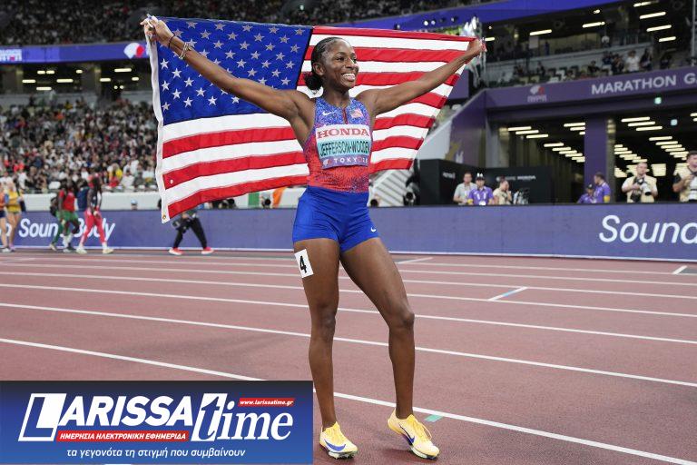 Η Αμερικανίδα Τζέφερσον κατέκτησε την πρώτη θέση στον αγώνα των 100 μέτρων στο Παγκόσμιο Πρωτάθλημα Στίβου στο Τόκιο, σημειώνοντας ρεκόρ αγώνων 10.61. Η επίδοσή της αποτελεί την 4η καλύτερη όλων των εποχών.