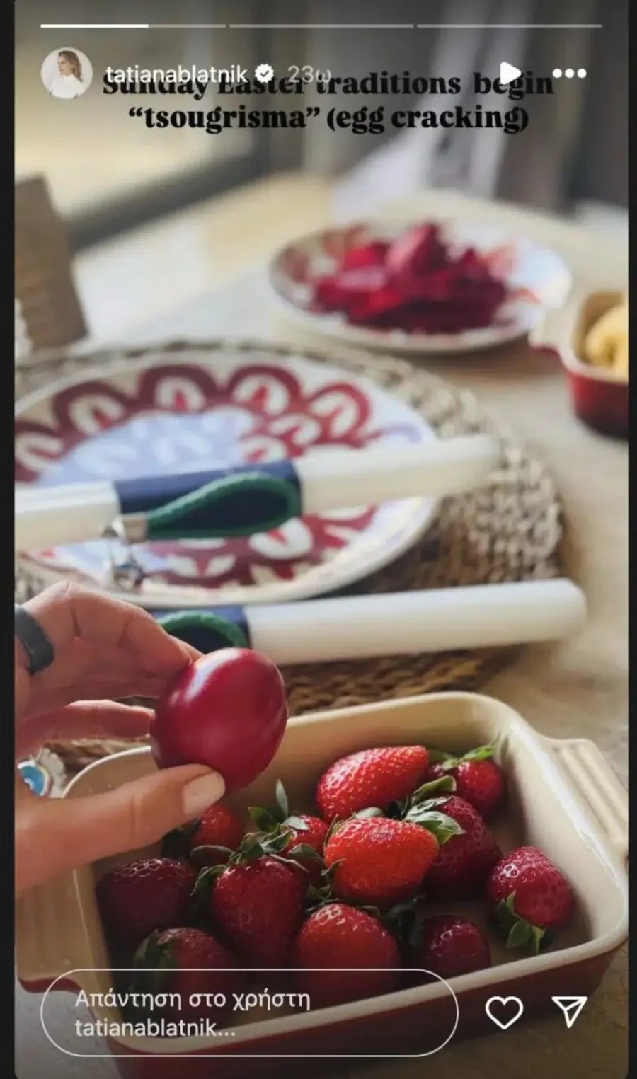 «Πριν πολλά χρόνια… μόλις “έσκασε” στις αναμνήσεις: Η μέρα που έγινα Ελληνίδα Ορθόδοξη (Δεν μπορούσα να πιστέψω ότι μου κοβόταν ένα μέρος από τα μαλλιά μου!). Το σημερινό συναίσθημα είναι ευγνωμοσύνη και γαλήνη. Χρόνια πολλά! Καλό Πάσχα» έγραψε.