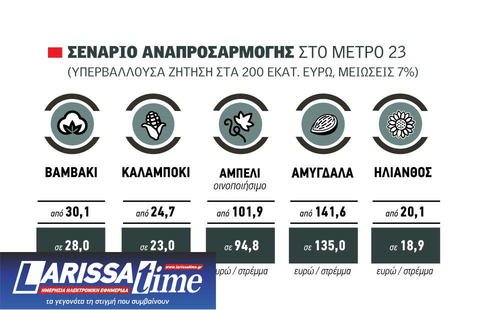 Σε περίπτωση που η υπερβάλλουσα ζήτηση διαμορφωθεί ας πούμε στα 200 εκατ. ευρώ, τότε θα χρειαστεί μία οριζόντια περικοπή 7% από τα ακόλουθα ποσά αναφοράς. Το ίδιο θα ισχύσει και για τις έκτακτες ενισχύσεις στο Κωπαϊδικό Πεδίο. Ενδεικτικά, σε ένα τέτοιο σενάριο, η έκτακτη ενίσχυση για το βαμβάκι θα υποχωρήσει στα 28 ευρώ το στρέμμα, για τα αμύγδαλα στα 135 ευρώ το στρέμμα, στο καλαμπόκι στα 23 ευρώ το στρέμμα, στον ηλίανθο στα 18,9 ευρώ το στρέμμα και στο οινοποιήσιμο αμπέλι στα 94,8 ευρώ το στρέμμα.