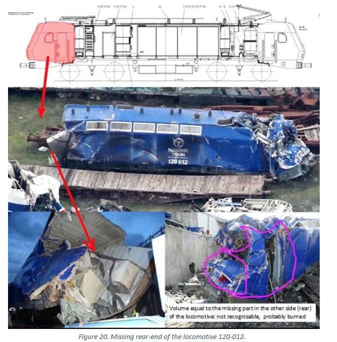 Επίσης, τονίζεται ότι «η πίσω καμπίνα του μηχανοδηγού της μηχανής 120-012 φαίνεται να έχει αποκοπεί από το υπόλοιπο όχημα και δεν μπορεί να αναγνωριστεί πλήρως πουθενά μεταξύ των συντριμμιών, εκτός από ένα μικρό τμήμα της οροφής της και τον πάνω προβολέα της (μπροστά από το πρώτο εμπορευματοκιβώτιο). Το υπόλοιπο τμήμα της καμπίνας δεν μπορεί να αναγνωριστεί ως ενιαία δομή, ενώ επίσης το μπροστινό πίνακα με τον βαμμένο αριθμό και οι δύο κόκκινοι προβολείς δεν είναι αναγνωρίσιμοι μεταξύ των συντριμμιών. Πιθανότατα, η ελλείπουσα δομή βρίσκεται μεταξύ των κατεστραμμένων και απανθρακωμένων υπολειμμάτων του Βαγονιού Εστιατορίου, καθώς αυτό είναι το μοναδικό σημείο σε ολόκληρη την τοποθεσία του δυστυχήματος όπου η πυρκαγιά έκαιγε τόσο έντονα, ώστε κατέστρεψε εντελώς το βαρέως βιομηχανικού τύπου μπλε χρώμα της μηχανής, καθιστώντας την μη αναγνωρίσιμη».