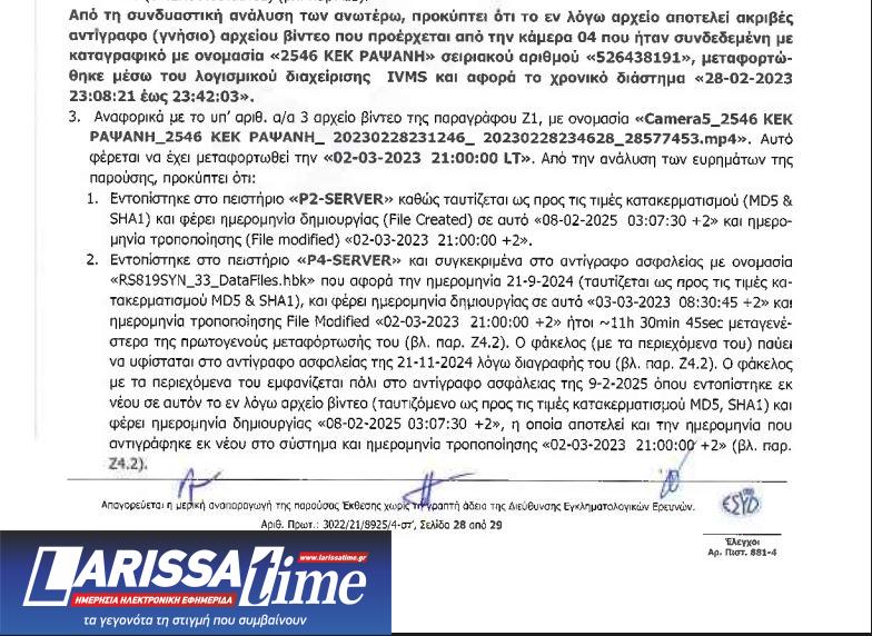 Ερωτήματα ωστόσο προκύπτουν από τη δεύτερη έκθεση των εμπειρογνωμόνων της ΕΛ.ΑΣ καθώς από την ανάκτηση των δεδομένων προέκυψαν εγγραφές παλαιότερων καταγραφών βίντεο, ενώ δεν προέκυψε εγγραφή που να αφορά την 28.02.20023.