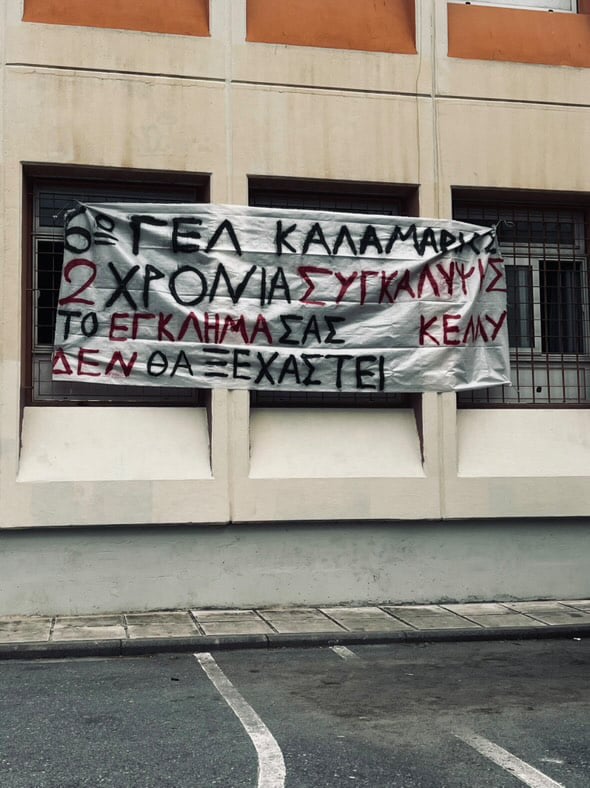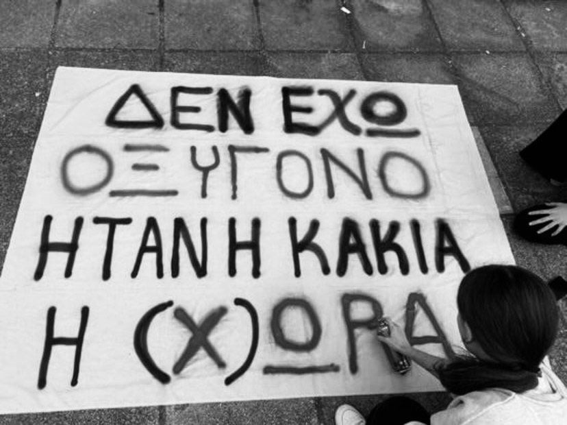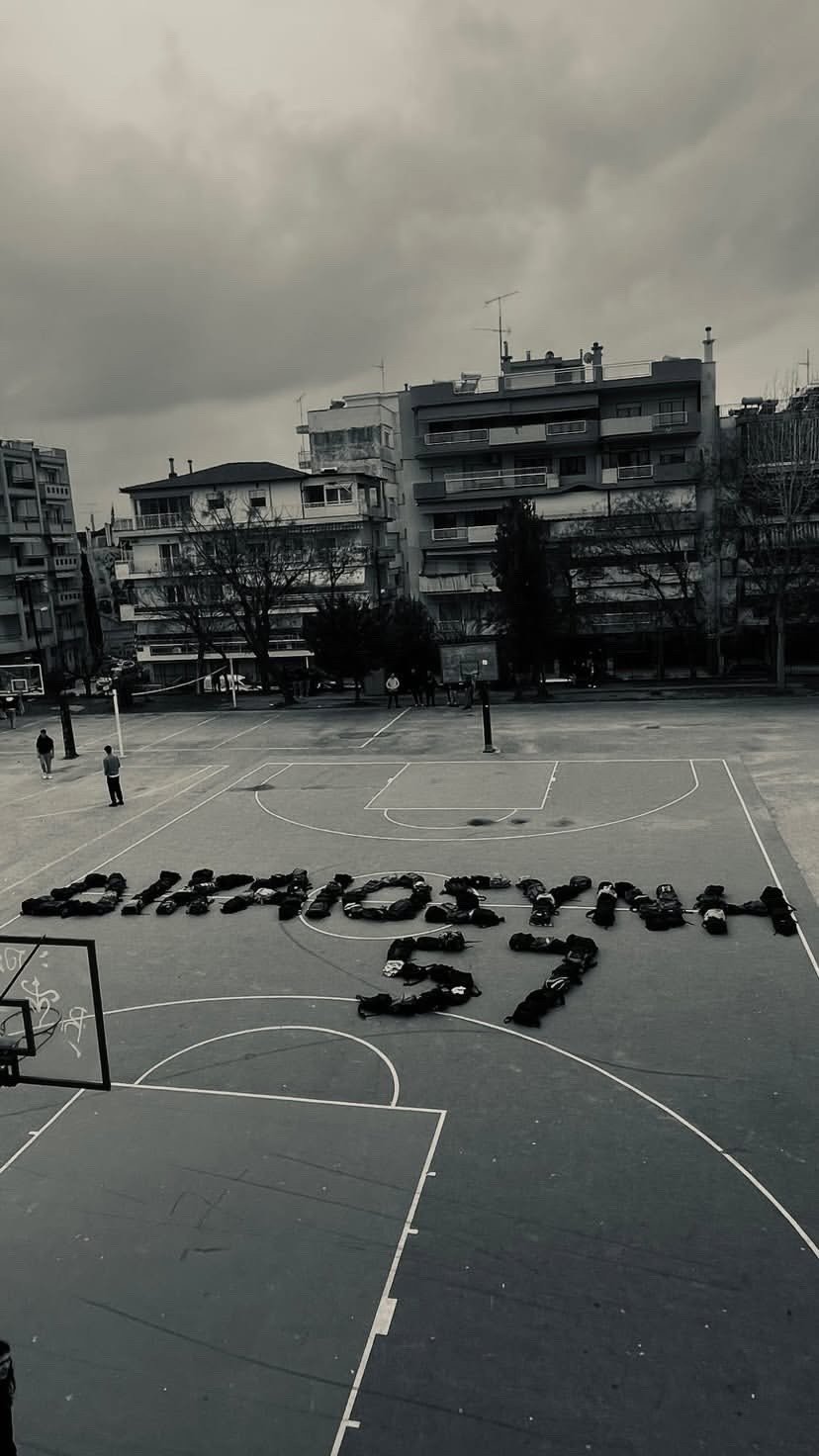 «Δεν έχω οξυγόνο» έγραψαν κάτω από το έργο τους οι μαθητές, ενώ στην αυλή του σχολείου σχημάτισαν με τις τσάντες τους την φράση «Δικαιοσύνη 57».