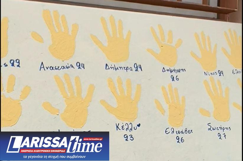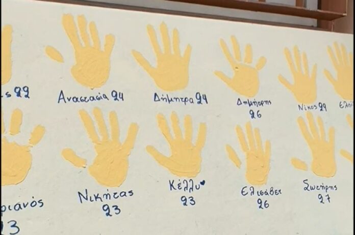 Συγκεκριμένα, μαθητές στο 6ο Γενικό Λύκειο Καλαμαριάς ζωγράφισαν σε τοίχο του σχολείου 57 παλάμες, όσα και τα θύματα της σιδηροδρομικής τραγωδίας στα Τέμπη. Κάτω από κάθε παλάμη έγραψαν τα ονόματα και τις ηλικίες τους.