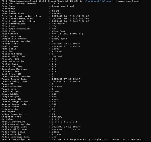 1.2. Ανάλυση Μεταδεδομένων (metadata) του βίντεο, τα οποία μπορούν να δώσουν πληροφορίες σχετικά με την ημερομηνία, την ώρα και τη συσκευή που χρησιμοποιήθηκε για την καταγραφή. Εργαλεία όπως το Exif Tool μπορούν να εξάγουν αυτές τις πληροφορίες.