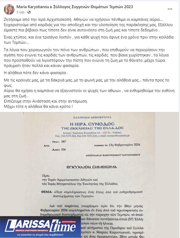 Με σχετική εγκύκλιο η Ιερά Σύνοδος της Εκκλησίας της Ελλάδας ενημερώνει σχετικά όλες τις Μητροπόλεις για αυτή την πρωτοβουλία μετά από σχετικό αίτημα που έγινε δεκτό της προέδρου του Συλλόγου Συγγενών Θυμάτων Τεμπών, Μαρίας Καρυστιανού.