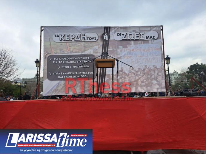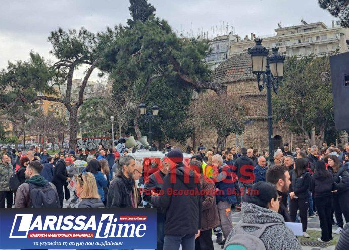 Απεργιακή συγκέντρωση για τα εργασιακά δικαιώματα, τους μισθούς, τις καλύτερες συνθήκες υγιεινής και ασφάλειας στον χώρο εργασίας πραγματοποιείται στο κέντρο της Θεσσαλονίκης, με αφορμή τον έναν χρόνο από το πολύνεκρο σιδηροδρομικό δυστύχημα των Τεμπών.