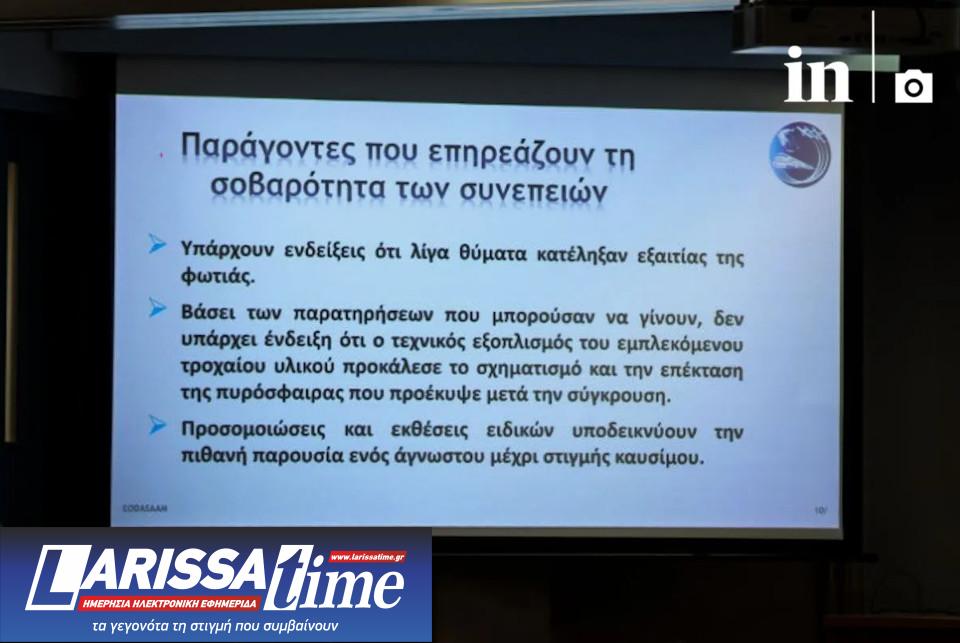 Ειδικότερα, στο πόρισμά του ο ΕΟΔΑΣΑΑΜ καταγράφει στοιχεία και αναλύσεις για τη φωτιά που προκλήθηκε μετά τη σύγκρουση των τρένων και την πιθανή παρουσία εύφλεκτων υλικών, που δεν είχαν δηλωθεί. Πιο συγκεκριμένα, όλα τα υλικά στις μηχανές των τρένων δεν δικαιολογούν το ύψος της πυρόσφαιρας που προκλήθηκε μετά τη σύγκρουση στα Τέμπη. Γι’ αυτό και αφήνεται ανοιχτό το ενδεχόμενο ενός «άγνωστου καυσίμου», που οδήγησε στη μεγάλη φωτιά, από την οποία εκτιμάται ότι πέθαναν 5 με 7 άνθρωποι.