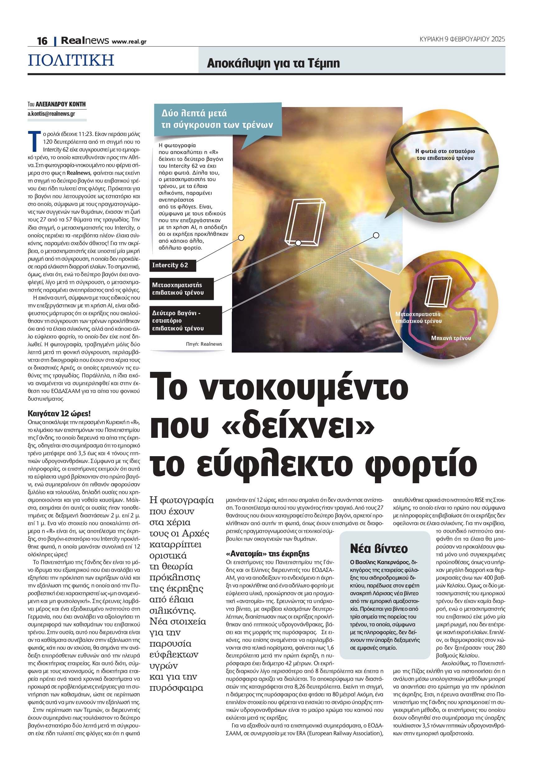 Η εικόνα αυτή, σύμφωνα με τους ειδικούς που την επεξεργάστηκαν με τη χρήση ΑΙ, είναι αδιάψευστος μάρτυρας ότι οι εκρήξεις που ακολούθησαν τη σύγκρουση των τρένων προκλήθηκαν όχι από τα έλαια σιλικόνης, αλλά από κάποιο άλλο εύφλεκτο φορτίο, το οποίο δεν είχε ποτέ δηλωθεί. Η φωτογραφία, τραβηγμένη μόλις δύο λεπτά μετά τη φονική σύγκρουση, περιλαμβάνεται στη δικογραφία που έχουν στα χέρια τους οι δικαστικές Αρχές, οι οποίες ερευνούν τις ευθύνες της τραγωδίας. Παράλληλα, η ίδια εικόνα αναμένεται να συμπεριληφθεί και στην έκθεση του ΕΟΔΑΣΑΑΜ για τα αίτια του φονικού δυστυχήματος», ανέφερε το δημοσίευμα της εφημερίδας.