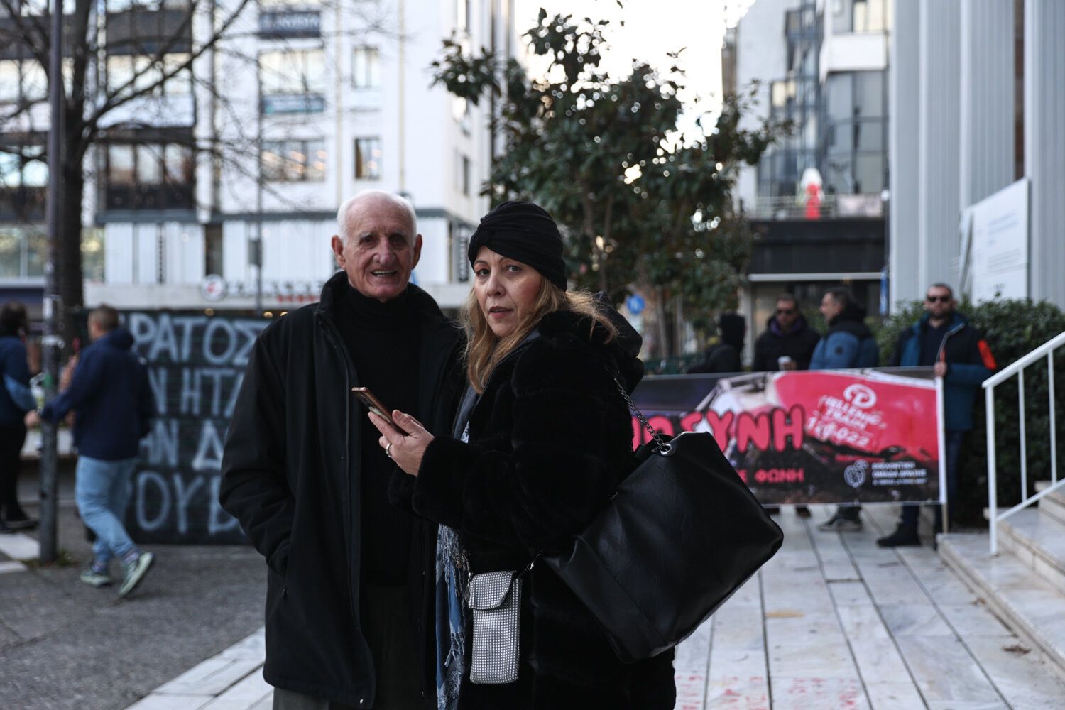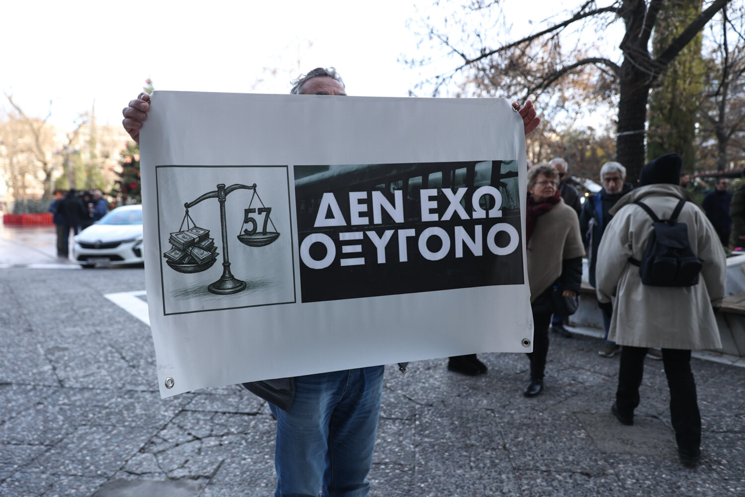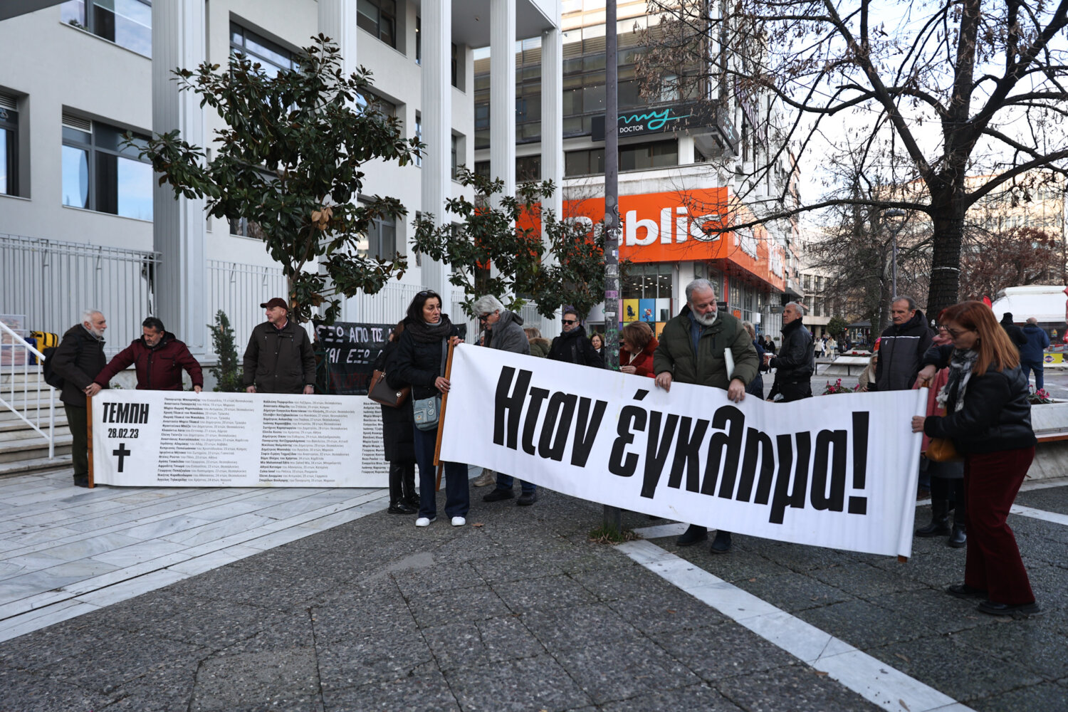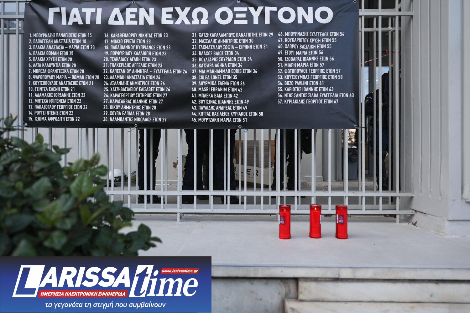 Έξω από το Δικαστικό Μέγαρο Λάρισας βρίσκονται το πρωί της Παρασκευής συγγενείς των θυμάτων της τραγωδίας, όπως και εκπρόσωποι συλλογικοτήτων οι οποίοι έχουν ανοίξει πανό και φωνάζουν συνθήματα.
