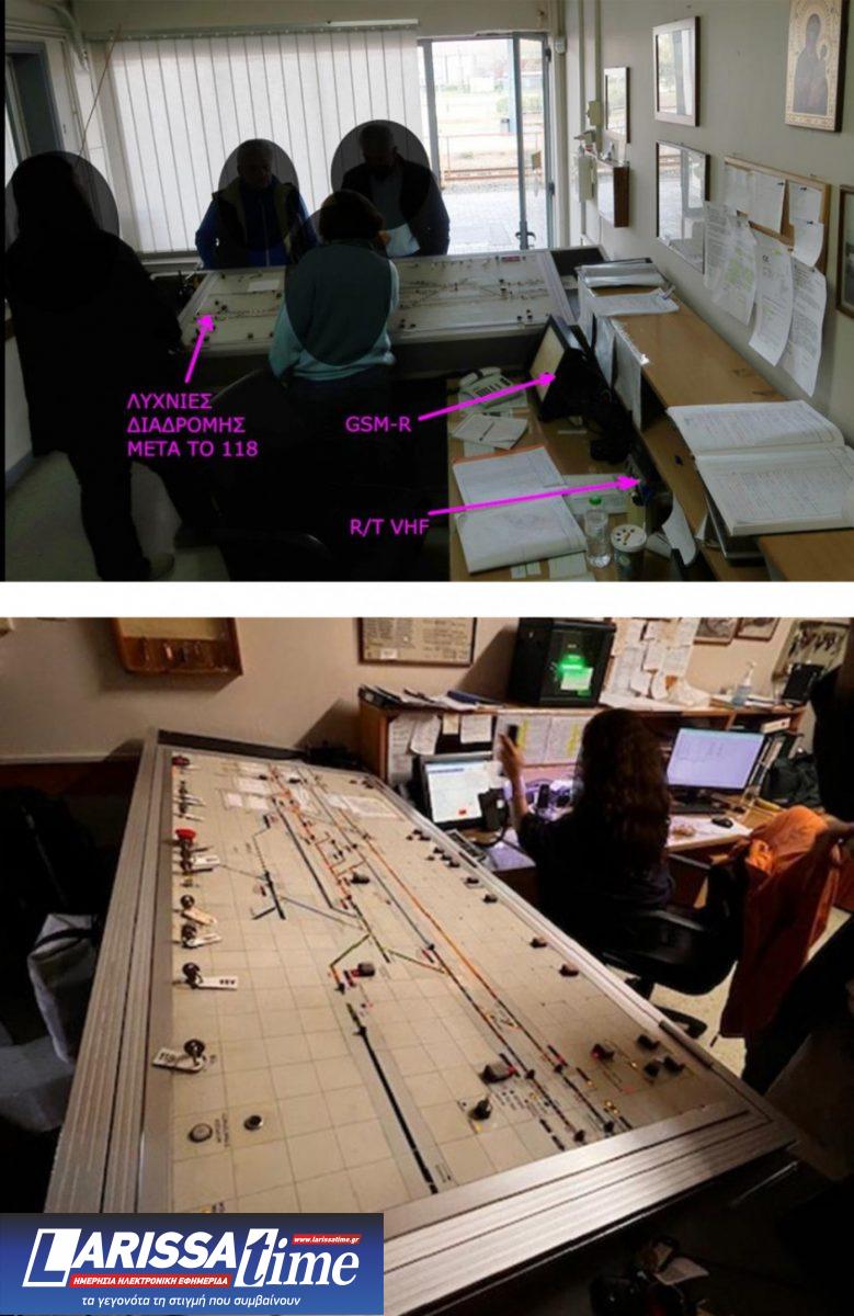 Οι θέσεις των σταθμαρχών όταν βλέπουν προς τον πίνακα ελέγχου (επάνω) και όταν επικοινωνούν (κάτω) με τον σταθμό Λάρισας