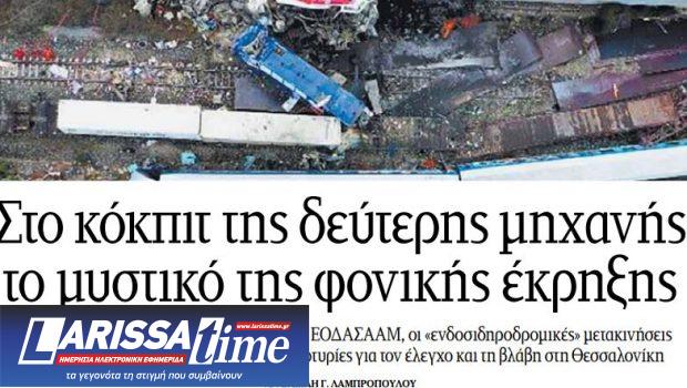 «Το μυστικό της φονικής έκρηξης, -όπως δείχνουν πολλοί εμπειρογνώμονες – μπορεί να κρύβεται στο «άδειο» κόκπιτ στην πίσω πλευρά της δεύτερης μηχανής του εμπορικού τρένου! Το κόκπιτ αυτό, σύμφωνα με το πόρισμα του Εθνικού Οργανισμού Διερεύνησης Αεροπορικών και Σιδηροδρομικών Ατυχημάτων και Ασφάλειας Μεταφορών (ΕΟΔΑΣΑΑΜ) που παρουσιάστηκε χθες, έχει «εξαφανιστεί» από τον χώρο του τραγικού συμβάντος. Φέρεται να έχει διαλυθεί και αποτεφρωθεί από τη σύγκρουση και κυρίως την ανάφλεξή του, κάτι ωστόσο που δεν δικαιολογείται από τη θέση του στο εμπορικό τρένο και από τη μεταγενέστερη πορεία της φωτιάς».