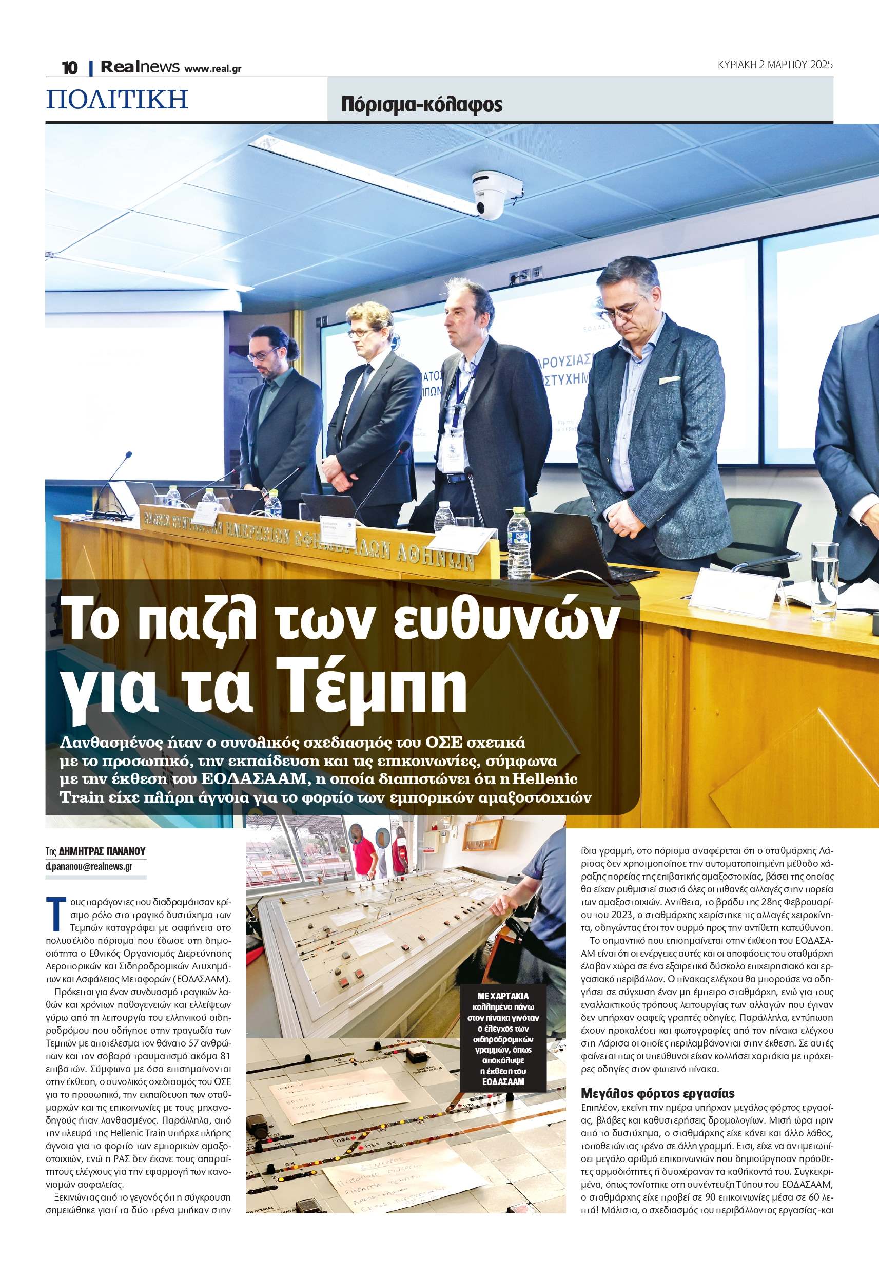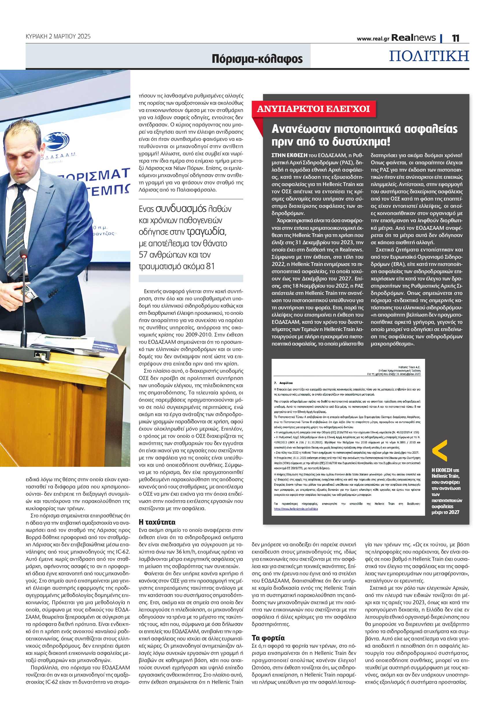 Στην έκθεση του ΕΟΔΑΣΑΑΜ, η Ρυθμιστική Αρχή Σιδηροδρόμων (ΡΑΣ), δηλαδή η αρμόδια εθνική Αρχή ασφάλειας, κατά την έκδοση της εξουσιοδότησης ασφαλείας για τη Hellenic Train και τον ΟΣΕ απέτυχε να εντοπίσει τις κρίσιμες αδυναμίες που υπήρχαν στο σύστημα διαχείρισης ασφάλειας των σιδηροδρόμων. Χαρακτηριστικά είναι τα όσα αναφέρονται στην ετήσια χρηματοοικονομική έκθεση της Hellenic Train για τη χρήση που έληξε στις 31 Δεκεμβρίου του 2023, την οποία έχει στη διάθεσή της η Realnews.