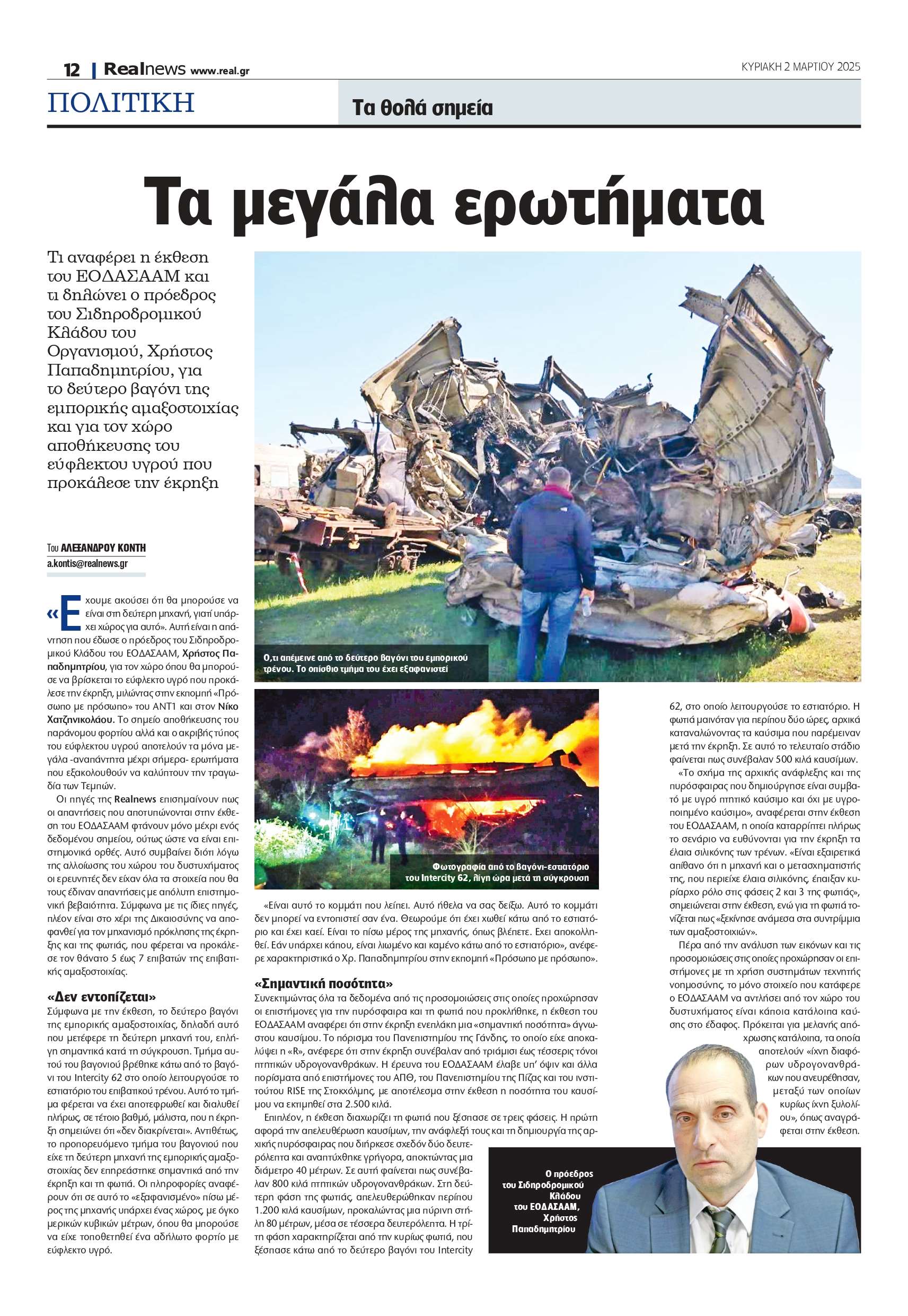 «Εχουμε ακούσει ότι θα μπορούσε να είναι στη δεύτερη μηχανή, γιατί υπάρχει χώρος για αυτό». Αυτή είναι η απάντηση που έδωσε ο πρόεδρος του Σιδηροδρομικού Κλάδου του ΕΟΔΑΣΑΑΜ, Χρήστος Παπαδημητρίου, για τον χώρο όπου θα μπορούσε να βρίσκεται το εύφλεκτο υγρό που προκάλεσε την έκρηξη, μιλώντας στην εκπομπή «Πρόσωπο με πρόσωπο» του ΑΝΤ1 και στον Νίκο Χατζηνικολάου. Το σημείο αποθήκευσης του παράνομου φορτίου αλλά και ο ακριβής τύπος του εύφλεκτου υγρού αποτελούν τα μόνα μεγάλα -αναπάντητα μέχρι σήμερα- ερωτήματα που εξακολουθούν να καλύπτουν την τραγωδία των Τεμπών. Οι πηγές της Realnews επισημαίνουν πως οι απαντήσεις που αποτυπώνονται στην έκθεση του ΕΟΔΑΣΑΑΜ φτάνουν μόνο μέχρι ενός δεδομένου σημείου, ούτως ώστε να είναι επιστημονικά ορθές. Αυτό συμβαίνει διότι λόγω της αλλοίωσης του χώρου του δυστυχήματος οι ερευνητές δεν είχαν όλα τα στοιχεία που θα τους έδιναν απαντήσεις με απόλυτη επιστημονική βεβαιότητα. Σύμφωνα με τις ίδιες πηγές, πλέον είναι στο χέρι της Δικαιοσύνης να αποφανθεί για τον μηχανισμό πρόκλησης της έκρηξης και της φωτιάς, που φέρεται να προκάλεσε τον θάνατο 5 έως 7 επιβατών της επιβατικής αμαξοστοιχίας.