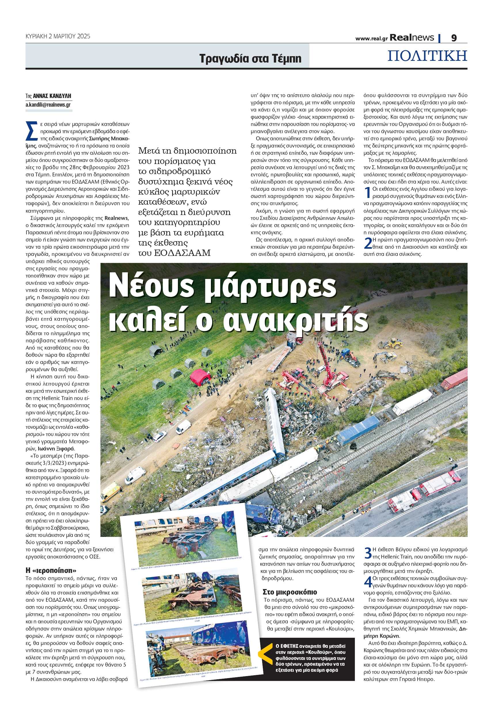 Σε σειρά νέων μαρτυρικών καταθέσεων προχωρά αυτή την εβδομάδα ο εφέτης ειδικός ανακριτής Σωτήρης Μπακαΐμης, αναζητώντας το ή τα πρόσωπα τα οποία έδωσαν ρητή εντολή για την αλλοίωση του σημείου όπου συγκρούστηκαν οι δύο αμαξοστοιχίες το βράδυ της 28ης Φεβρουαρίου 2023 στα Τέμπη. Επιπλέον, μετά τη δημοσιοποίηση των ευρημάτων του ΕΟΔΑΣΑΑΜ (Εθνικός Οργανισμός Διερεύνησης Αεροπορικών και Σιδηροδρομικών Ατυχημάτων και Ασφάλειας Μεταφορών), δεν αποκλείεται η διεύρυνση του κατηγορητηρίου.