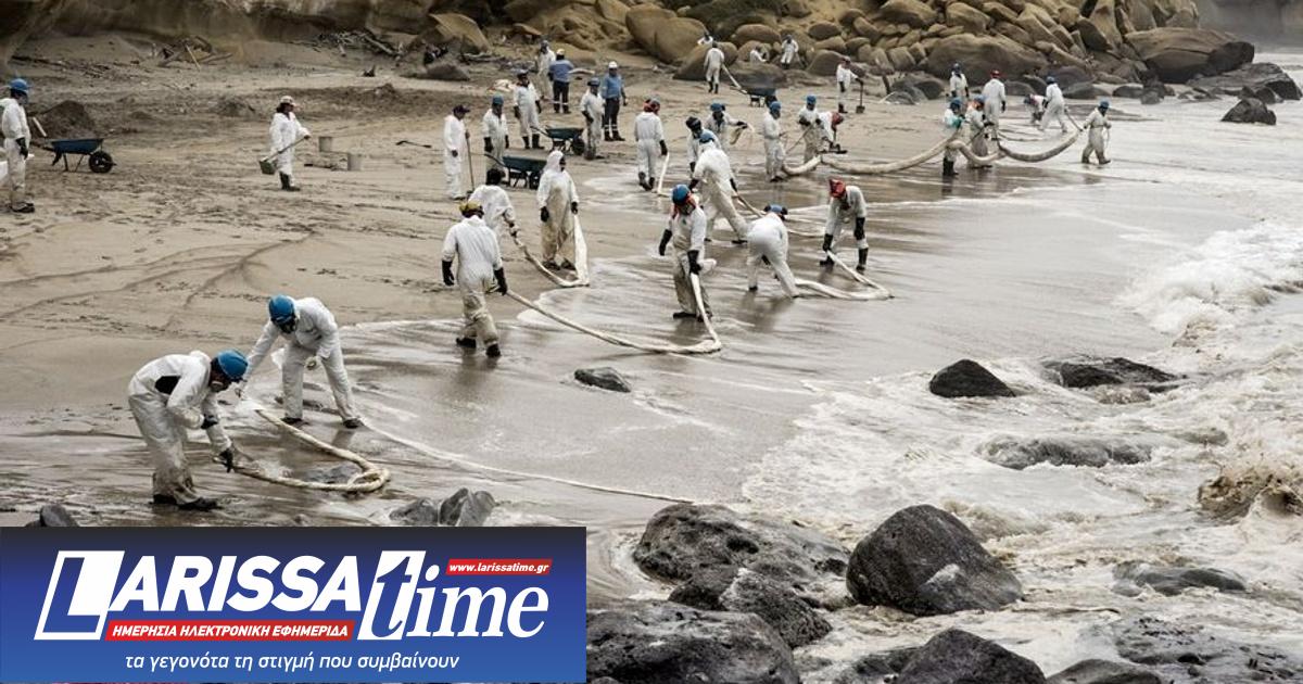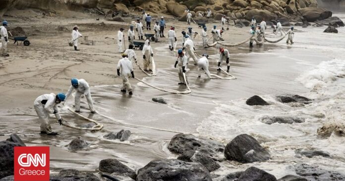 Την έκταση της θαλάσσιας ρύπανσης καταγράφει με τον πλέον γλαφυρό τρόπο εικόνα στην οποία δεκάδες εργαζόμενοι της κρατικής πετρελαϊκής εταιρείας Petroperu πραγματοποιούν εργασίες καθαρισμού της ακτής.