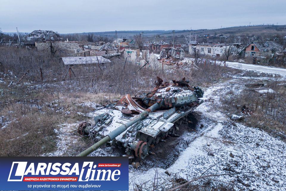 Ένα κατεστραμμένο ρωσικό τανκ καλυμμένο από χιόνι στέκεται στο χωριό Καμιάνκα, στην περιοχή του Χάρκοβο, στην Ουκρανία, το Σάββατο 14 Ιανουαρίου 2023.