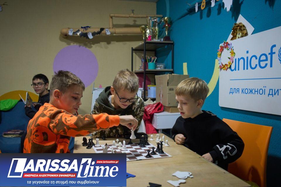 Παιδιά παίζουν σκάκι σε υπόγειο καταφύγιο στη Χερσόνα τον Νοέμβριο του 2025