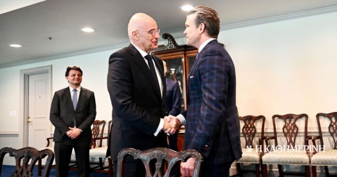 Στις στρατηγικές προκλήσεις της Ελλάδας και τις εθνικές θέσεις πάνω σε προβλήματα στην περιοχή της, αλλά και στην καλύτερη δυνατή εκτέλεση της σύμβασης των F-35 καθώς και άλλων εξοπλιστικών αγορών από τις ΗΠΑ αναφέρθηκε χθες ο υπουργός Εθνικής Αμυνας Νίκος Δένδιας, λίγο μετά τη συνάντηση που είχε με τον ομόλογό του υπουργό Πολέμου Πιτ Χέγκσεθ στην Ουάσιγκτον. Ο κ. Δένδιας ενημέρωσε τον κ. Χέγκσεθ για την προσπάθεια μεταρρύθμισης των Ελληνικών Ενόπλων Δυνάμεων (Ατζέντα 2030), ενώ του απηύθυνε πρόσκληση να επισκεφθεί την Ελλάδα στο προσεχές μέλλον. Στη συνάντηση τέθηκαν, ευλόγως, και οι περιφερειακές εξελίξεις, καθώς η Ελλάδα βρίσκεται στην εγγύς γεωγραφική περιφέρεια του πολέμου στην Ουκρανία αλλά και της ευρύτερης Μέσης Ανατολής, η οποία εξακολουθεί να βρίσκεται σε συνθήκες πιθανής έκρηξης, αυτή τη φορά με επίκεντρο το Ιράν.