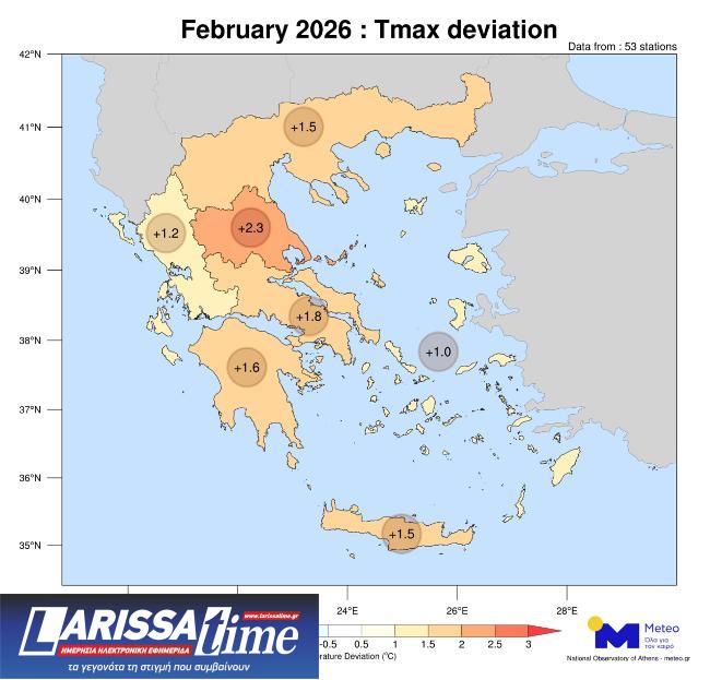 Σύμφωνα με το δίκτυο των 53 μετεωρολογικών σταθμών του meteo.gr και του Εθνικού Αστεροσκοπείου Αθηνών (Ε.Α.Α.), τον Φεβρουάριο του 2026 η μέση τιμή των μεγίστων ημερήσιων θερμοκρασιών κυμάνθηκε σε υψηλότερα για την εποχή επίπεδα (σε σύγκριση με τον μέσο όρο της περιόδου 2010–2019) σε όλα τα γεωγραφικά διαμερίσματα.