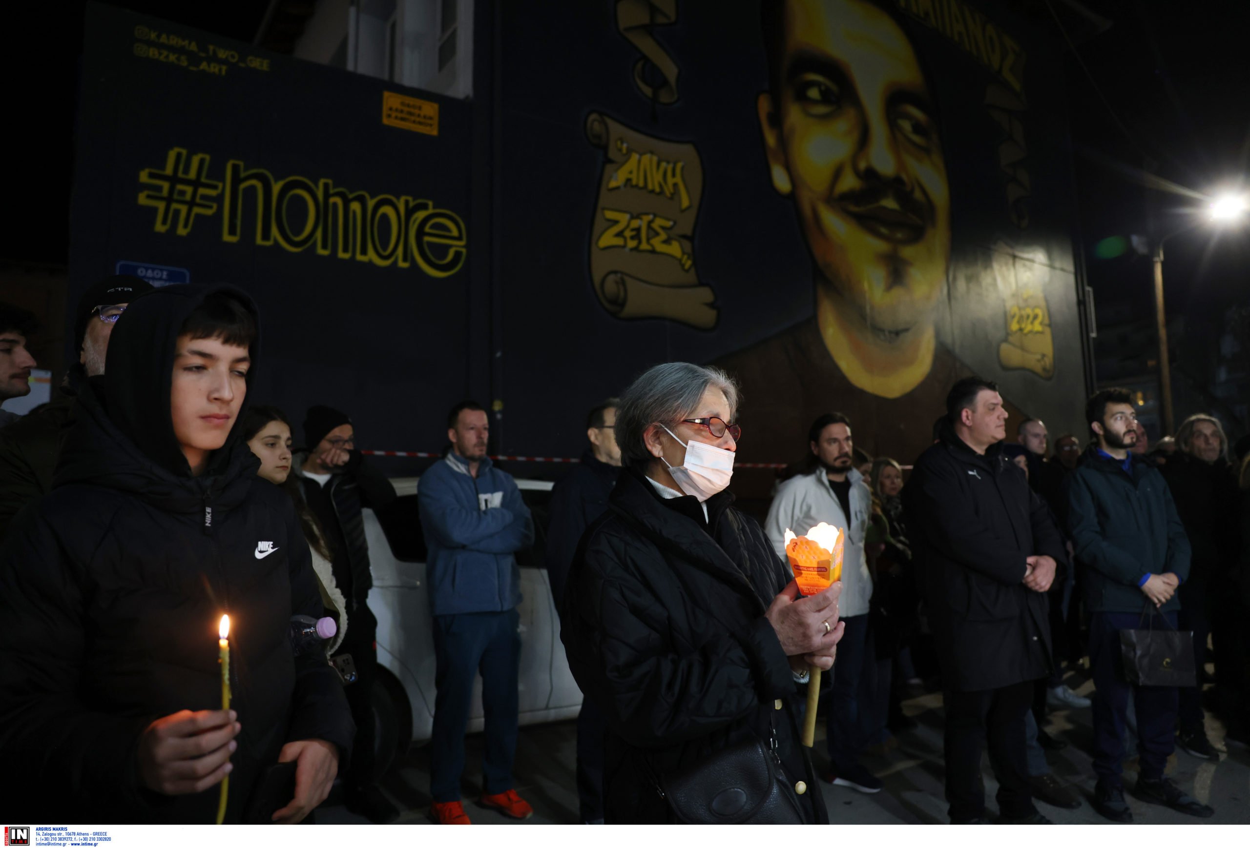 Δεκαεννέα κεριά, όσα και τα χρόνια ζωής του 19χρονου, Άλκη Καμπανού, που δολοφονήθηκε την 1η Φεβρουαρίου 2022 σε τυφλό οπαδικό χτύπημα άναψαν απόψε στο σημείο όπου του επιτέθηκαν οι οπαδοί του ΠΑΟΚ, στην περιοχή της Χαριλάου στη Θεσσαλονίκη.