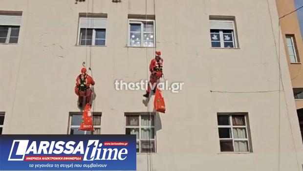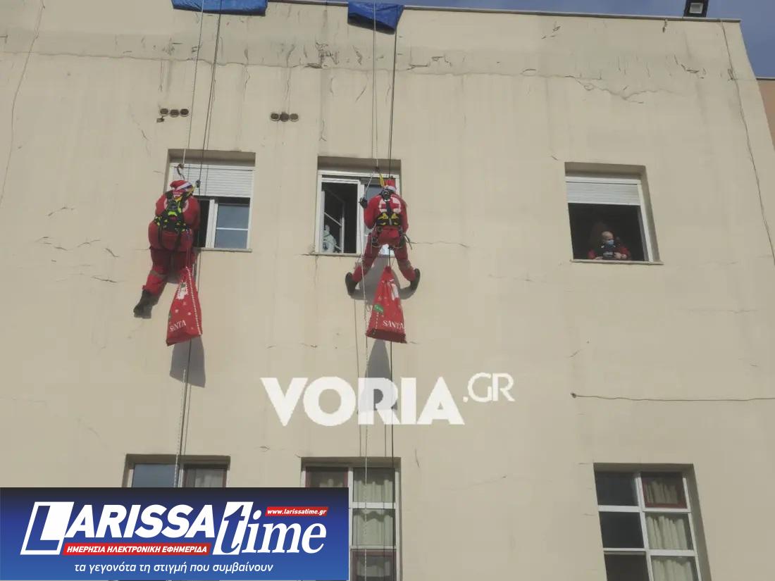 Μέλη του Ερυθρού Σταυρού, ντυμένοι με τη στολή του Άγιου Βασίλη αναρριχήθηκαν στα δωμάτια των παιδιών που νοσηλεύονται στην Παιδοογκολογική και Παιδιατρική κλινική του νοσοκομείου ΑΧΕΠΑ στη Θεσσαλονίκη και τους μοίρασαν δώρα, σκορπίζοντας χαμόγελα και αισιοδοξία.