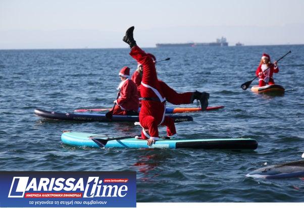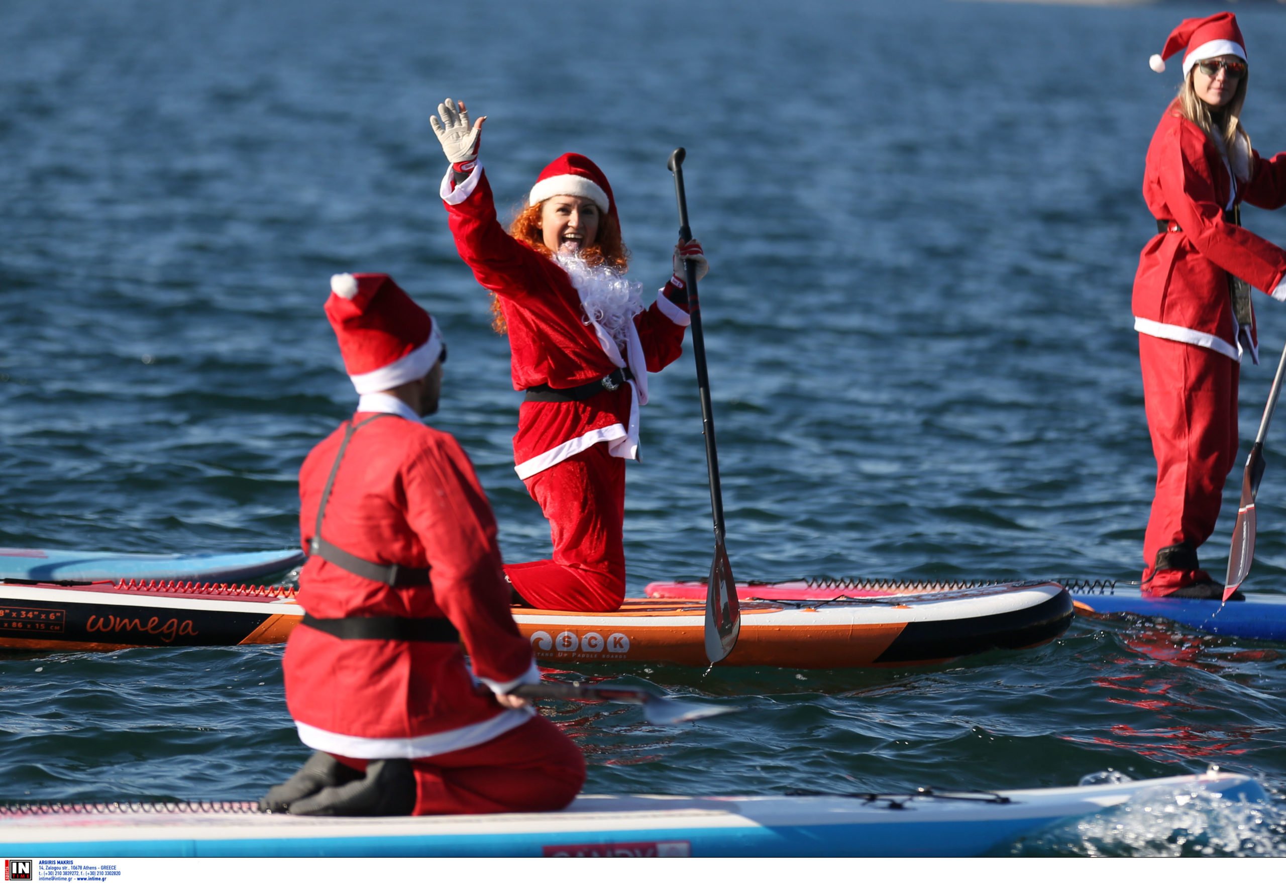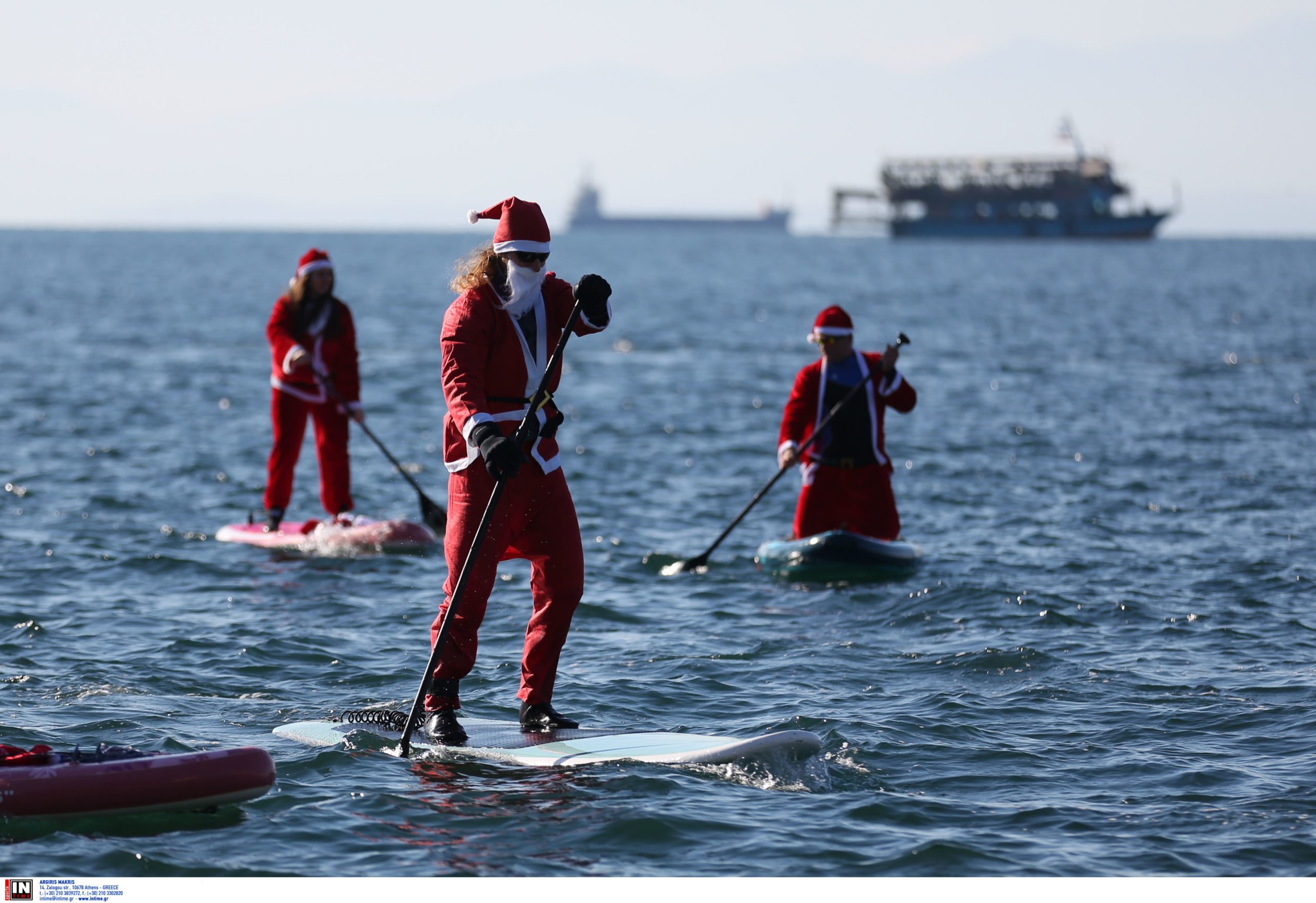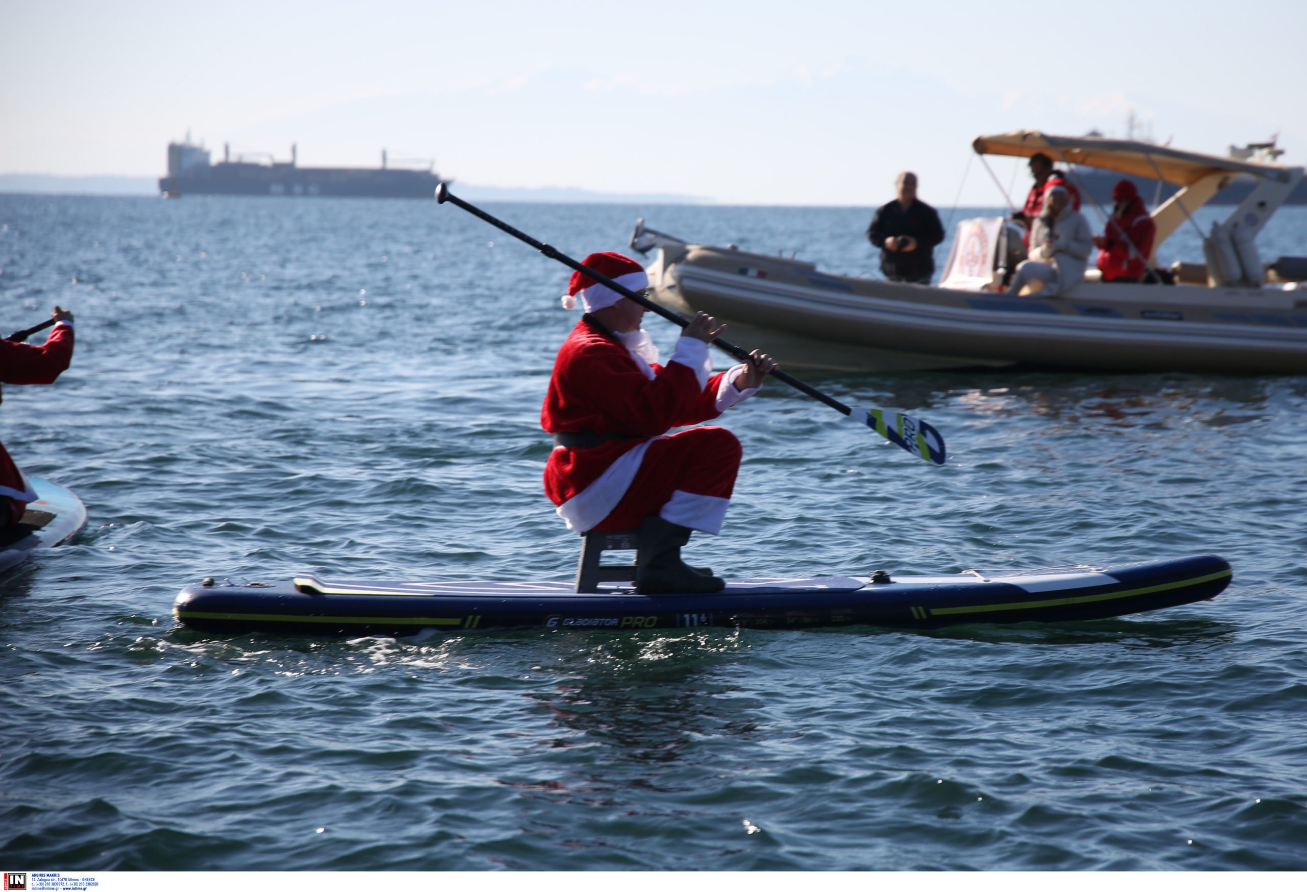Σε μια δεύτερη δράση, άνδρες και γυναίκες φόρεσαν τις κόκκινες στολές και τους σκούφους του Άι Βασίλη και κωπηλάτησαν με τις σανίδες sup στον Θερμαϊκό Κόλπο, στο πλαίσιο του 4oυ SANTA SUP, που διοργάνωσε για τέταρτη συνεχή χρονιά η ομάδα ThesSup.gr που βρίσκεται στο Ναυτικό Όμιλο Θεσσαλονίκης, στην οδό Σοφούλη και διεξήχθη υπό την αιγίδα της Ομοσπονδίας Κανόε Καγιάκ. Αμέσως μετά τη «βόλτα» στη θάλασσα, υπήρχε στην παραλία ένας κουμπαράς για το «Χαμόγελο του Παιδιού» ώστε οι ενδιαφερόμενοι να προσφέρουν προαιρετικά ό,τι επιθυμούν.