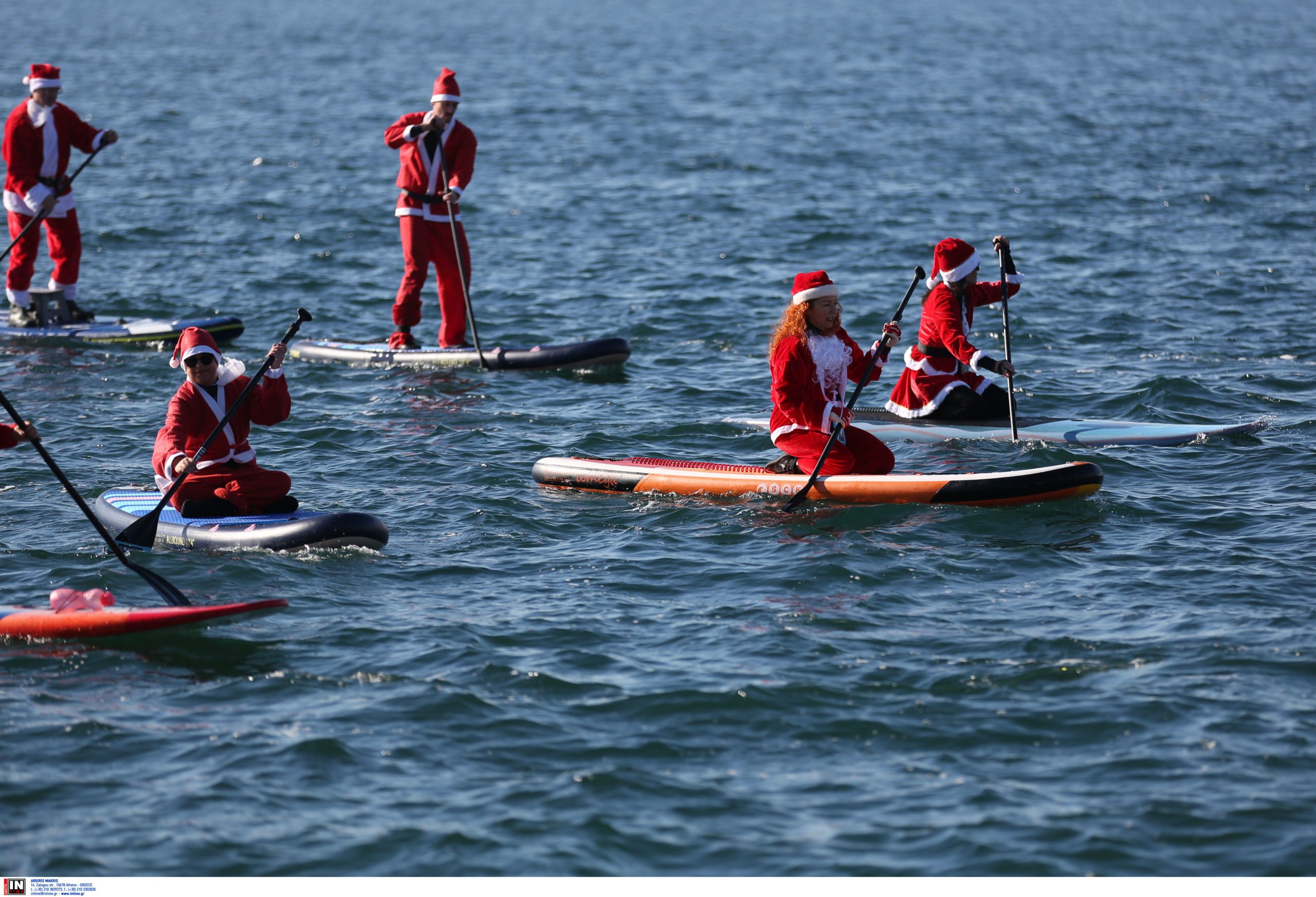 Στα νερά του Θερμαϊκού Κόλπου, στην Θεσσαλονίκη, βρέθηκαν σήμερα δεκάδες Άη Βασίληδες με κουπιά και κανό αλλά και με σανίδες sup, μεταφέροντας το γιορτινό κλίμα στην πόλη, λίγες ημέρες πριν από τις γιορτές των Χριστουγέννων και της Πρωτοχρονιάς.