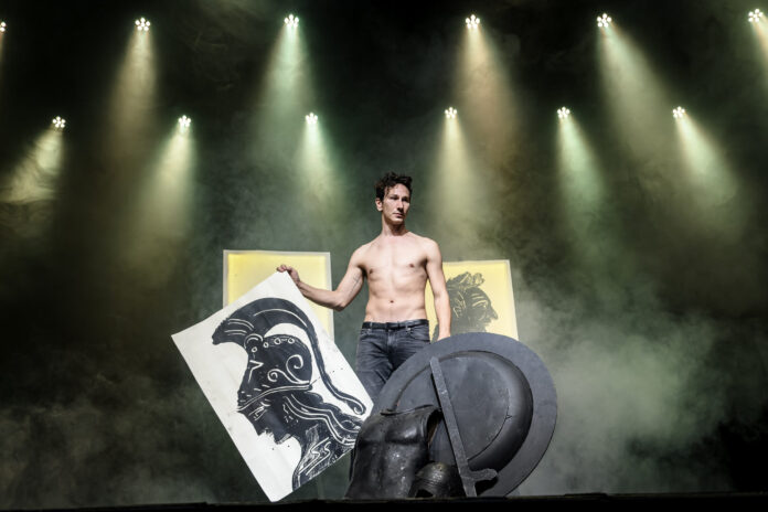 Ο Μιχάλης Σαράντης ερμηνεύει και τους εννιά ρόλους της τραγωδίας, ενώ ο Απόστολος Χαντζαράς συνομιλεί μαζί του ζωγραφίζοντας, μπροστά στα μάτια των θεατών.