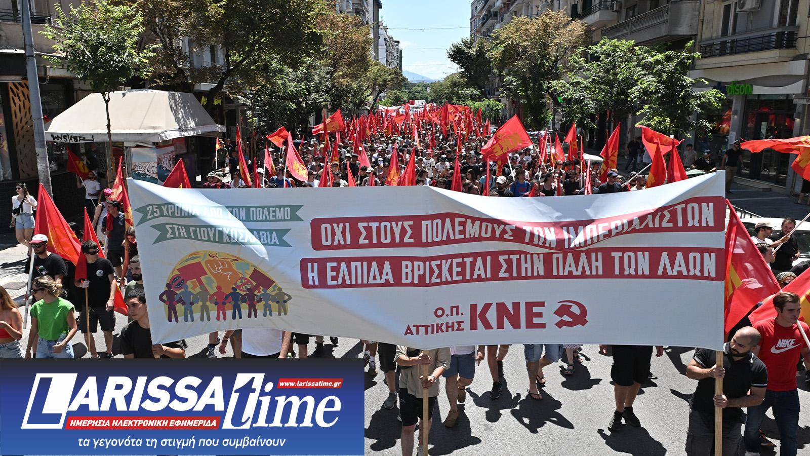 Αντιπολεμική πορεία πραγματοποίησαν σε κεντρικούς δρόμους της Θεσσαλονίκης μέλη του ΚΚΕ και της ΚΝΕ φωνάζοντας συνθήματα ενάντια στον ιμπεριαλισμό.