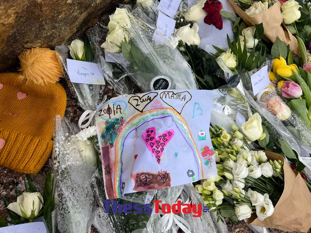 Ιδιαίτερη συγκίνηση προκαλεί μια παιδική ζωγραφιά με ένα δέντρο, ένα ουράνιο τόξο και μια καρδιά, πάνω στην οποία αναγράφονται τα ονόματα «Σοφία, Ζωή, Μαμά». Δίπλα, ένα κίτρινο σκουφάκι έχει τοποθετηθεί συμβολικά, σαν μια μικρή χειρονομία ζεστασιάς για μια ψυχή που έφυγε νωρίς.