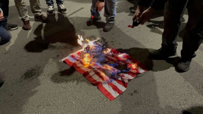 Στη συνέχεια, στο σημείο έφτασαν και οι συμμετέχοντες στη δεύτερη πορεία των μελών του αντιεξουσιαστικού χώρου και των κομμάτων της εξωκοινοβουλευτικής αριστεράς. Οι διαδηλωτές έκαψαν σημαίες των ΗΠΑ και του Ισραήλ και άναψαν καπνογόνα στα χρώματα της Παλαιστίνης.