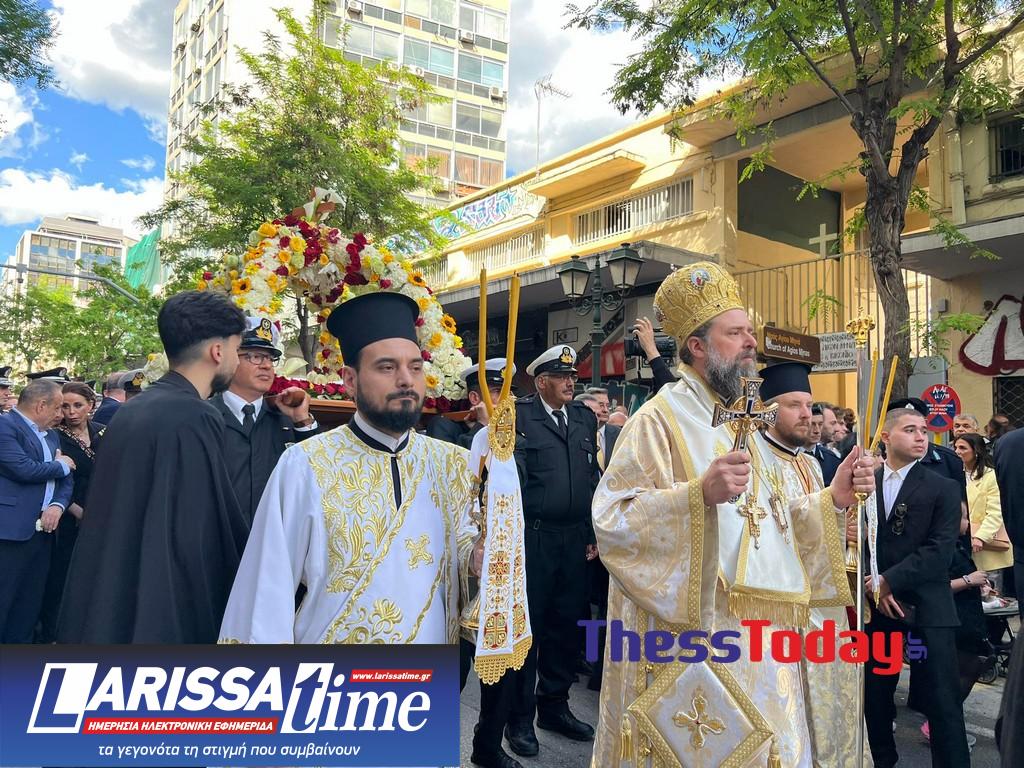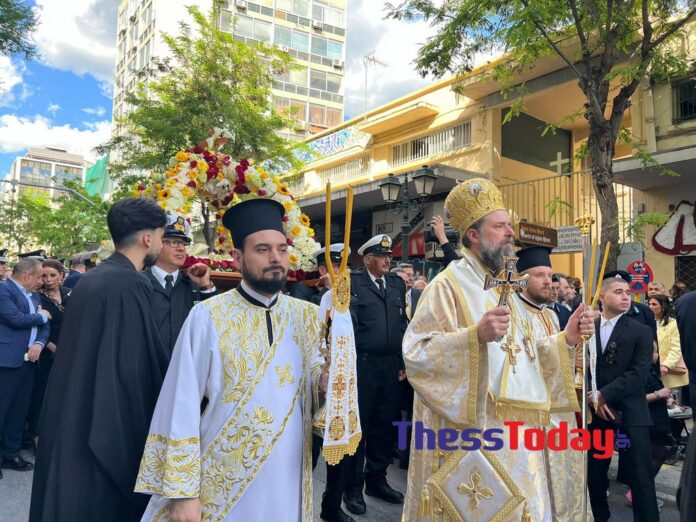 Η περιφορά ως είθισται, έγινε νωρίτερα από κάθε άλλη εκκλησία της πόλης, σύμφωνα με το ThessToday.gr, ώστε να την παρακολουθήσουν και οι εργαζόμενοι στα εμπορικά καταστήματα του κέντρου, τα οποία θα είναι σήμερα ανοιχτά μέχρι τις 19:00. Μέσα σε κλίμα θρησκευτικής ευλάβειας, χοροστατούντος του μητροπολίτη Φιλόθεου και υπό τους ήχους θρησκευτικών ψαλμωδιών από τη φιλαρμονική προσκόπων Νεαπόλεως, η πομπή ξεκίνησε την πορεία της στους κεντρικούς δρόμους της πόλης.