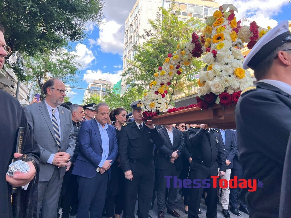 Τον επιτάφιο κουβαλούν αξιωματικοί του Ναυτικού και τον συνοδεύουν μέλη του Ελληνικού Ερυθρού Σταυρού αλλά και μικρά παιδιά που τον ραίνουν με λουλούδια.