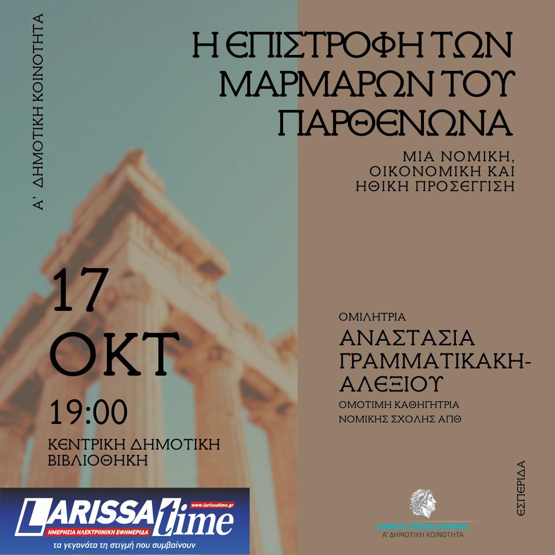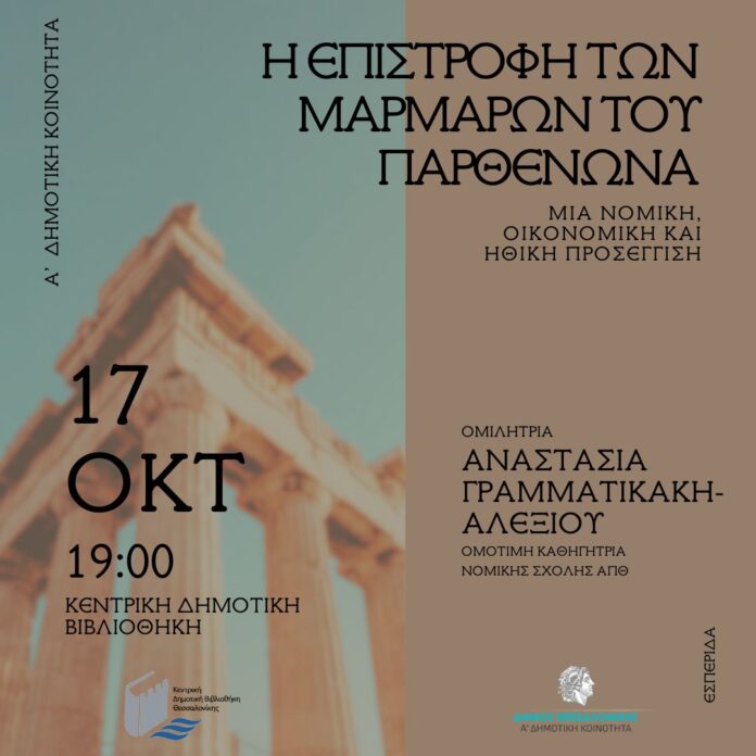 Εσπερίδα με θέμα «Η επιστροφή των μαρμάρων του Παρθενώνα – Μια νομική, οικονομική και ηθική προσέγγιση» οργανώνουν ο Δήμος Θεσσαλονίκης και η Α’ Δημοτική Κοινότητα σήμερα, Πέμπτη 17 Οκτωβρίου, στις 19.00, στην Κεντρική Δημοτική Βιβλιοθήκη.
