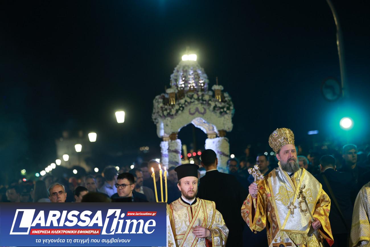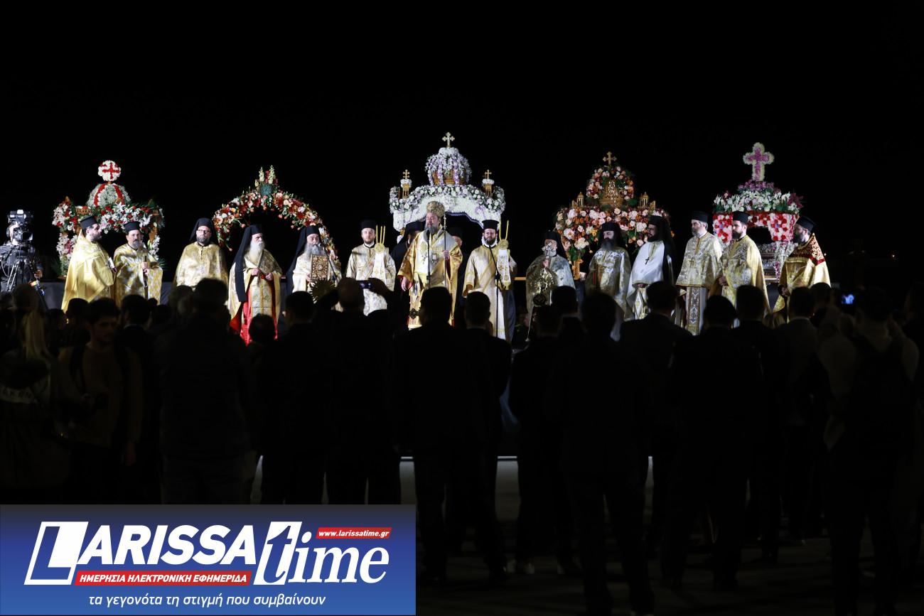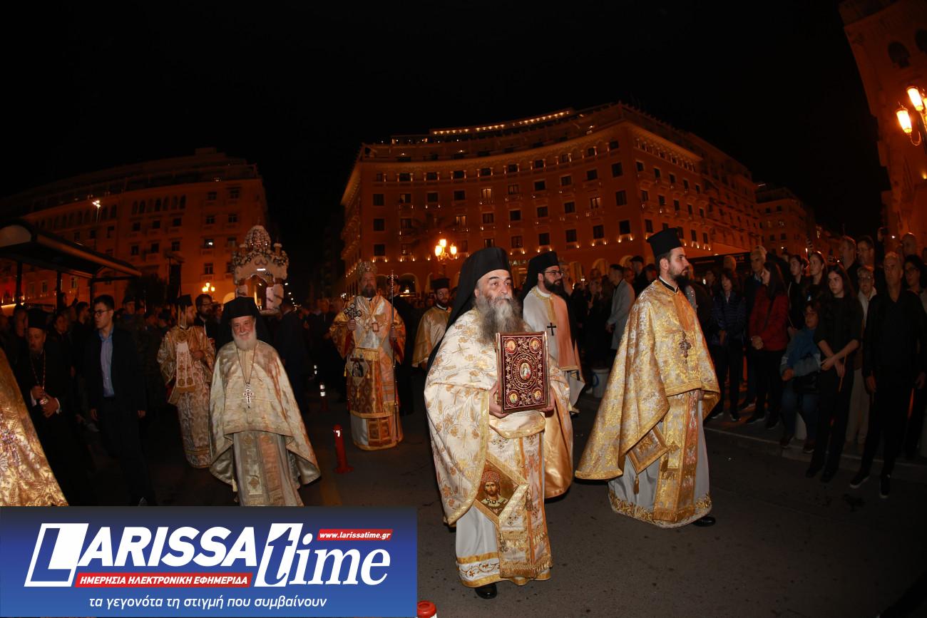 Λίγο μετά τις 9 το βράδυ άρχισαν να φτάνουν στην πλατεία Αριστοτέλους οι λιτανευτικές πομπές των επιταφίων του Μητροπολιτικού Ναού του Αγίου Γρηγορίου Παλαμά, των Ιερών Ναών της Του Θεού Σοφίας, Παναγίας Χαλκέων και Αγίου Νικολάου του Τρανού και της Ιεράς Μονής Αγίας Θεοδώρας με τους πιστούς να ψάλλουν τροπάρια του επιτάφιου θρήνου, που αποτελεί και την κορύφωση του θείου δράματος.