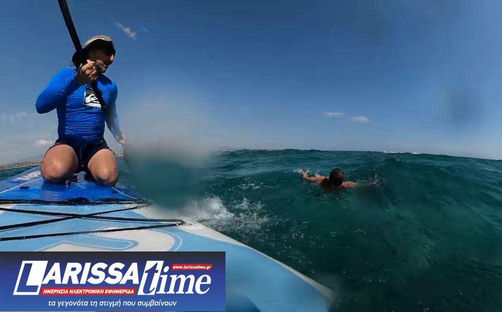 «Κοίταξα αμέσως γύρω μου, στην αρχή δεν τον είδα. Σηκώθηκα όρθιος πάνω στη σανίδα και έτσι τον είδα για 2-3 δευτερόλεπτα, γιατί αυτός μία βυθιζόταν μία έβγαινε στην επιφάνεια» συνεχίζει ο κ. Παπαϊωάννου, τονίζοντας πως στην περιοχή είχε αρκετό αέρα και κύμα. «Ήταν σε μία κατάσταση ημιλιπόθυμη, σε πανικό, σε σοκ. Δεν μπορούσε να αναπνεύσει. Με το που με είδε σηκώθηκε λίγο, πιάστηκε από τη σανίδα αλλά δεν μπορούσε να κρατηθεί καλά, γλιστρούσε, έβηχε, ξερνούσε νερό. Του κράτησα λίγο τα χέρια για να μπορέσει να κρατηθεί στη σανίδα, γιατί δεν είχε δυνάμεις, είχε εξαντληθεί τελείως ο άνθρωπος. Κάτσαμε ένα πεντάλεπτο, μιλήσαμε λίγο για να τον ηρεμήσω και εκεί άρχισε να αναπνέει. Αφού συνήλθε και ένιωσε έτοιμος, του είπα πώς να κρατηθεί από τη σανίδα και σιγά σιγά βγήκαμε έξω».