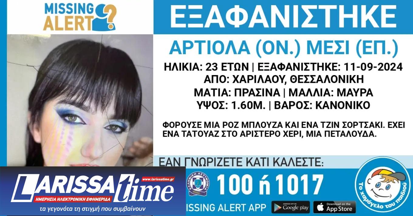 Συναγερμός σήμανε στις Αρχές για την εξαφάνιση της 23χρονης Αρτιόλα Μέσι από τη Χαριλάου, στην Ανατολική Θεσσαλονίκη.