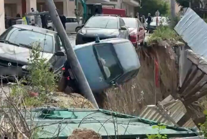 Αποτέλεσμα ήταν να προκληθούν ζημιές σε αυτοκίνητα που ήταν σταθμευμένα στο σημείο, ενώ λίγη ώρα μετά ένα από τα οχήματα έπεσε στο κενό.