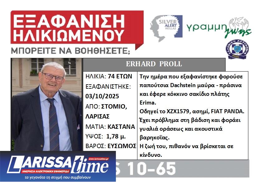 Είναι ο Έρχαρντ Προλ 74 χρόνων, ο οποίος ήταν λάτρης της Ελλάδας. Τα ίχνη του χάθηκαν την Παρασκευή 3 Οκτωβρίου, από το ξενοδοχείο που διέμενε στο Στόμιο Λάρισας, οδηγώντας το όχημα που είχε νοικιάσει και δεν έχει εντοπιστεί.