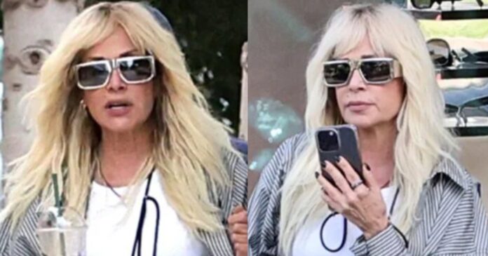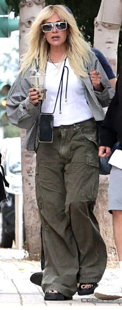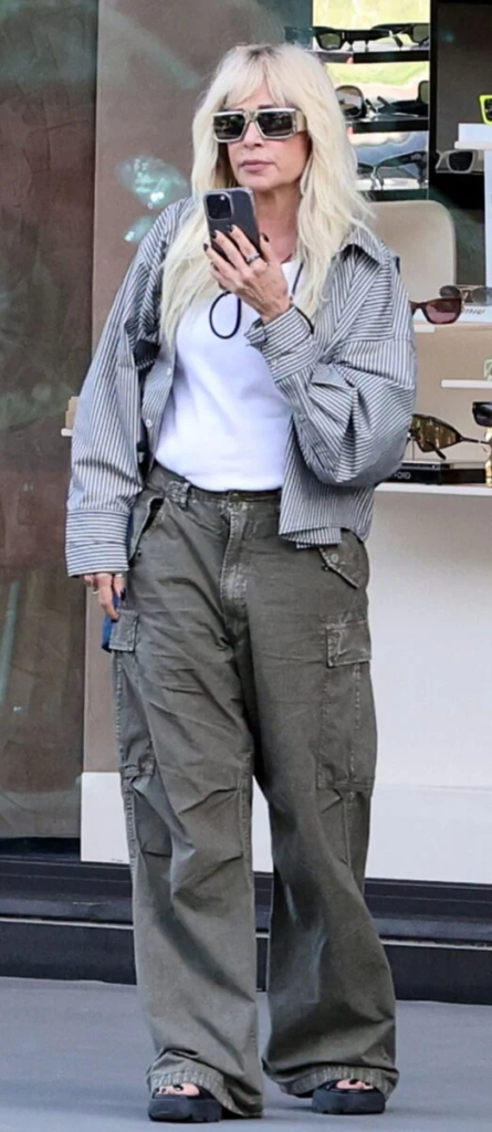 Η 66χρονη φόρεσε ένα cargo παντελόνι που είναι η τελευταία τάση της μόδας, το οποίο συνδύασε με λευκό tank top, και από πάνω φόρεσε ένα ριγέ cropped πουκάμισο.