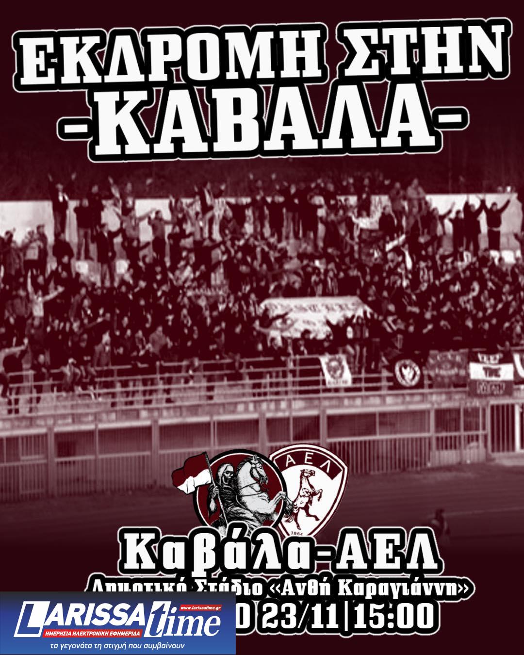 Με αφορμή την εκτός έδρας αναμέτρηση του πρωταθλήματος της Superleague 2 της ΑΕΛ με την Καβάλα, που θα γίνει το Σάββατο (23/11, 15:00) στο Δημοτικό Στάδιο Καβάλας “Ανθή Καραγιάννη”, οι οργανωμένοι οπαδοί των «βυσσινί» Θύρα 1, μέσα από τα social media, έγραψαν: «Όλοι Καβάλα για το διπλό. ΠΑΝΤΟΥ ΚΟΝΤΑ ΣΟΥ ΘΑ ΜΑΙ ΓΙΑ ΝΑ ΣΟΥ ΤΡΑΓΟΥΔΩ!!» μαζί με την αφίσα.