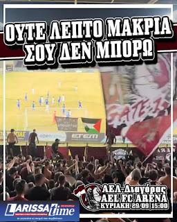 Με αφορμή την εντός έδρας αναμέτρηση του πρωταθλήματος της Superleague 2 της ΑΕΛ με το Διαγόρα Ρόδου, που θα γίνει την Κυριακή (29/09, 15:00) στο AEL FC Arena, οι οργανωμένοι οπαδοί των «βυσσινί» Θύρα 1, μέσα από τα social media, έκαναν την παρακάτω ανάρτηση με τίτλο στην αφίσα “ΟΥΤΕ ΛΕΠΤΟ ΜΑΚΡΙΑ ΣΟΥ ΔΕΝ ΜΠΟΡΩ”