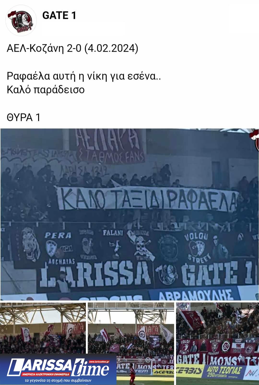 Με αφορμή την εντός έδρας αναμέτρηση για την Superleague 2 της ΑΕΛ με την Κοζάνη που έγινε την Κυριακή (04/02) στο AEL FC Arena οι οργανωμένοι οπαδοί των «βυσσινί» Θύρα 1 μέσα από τα social media έκαναν την παρακάτω ανάρτηση που έγραφε: “Ραφαέλα αυτή η νίκη για εσένα.. Καλό παράδεισο” μαζί με φωτογραφίες.