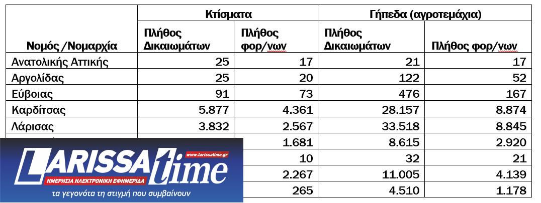 Με βάση τις αιτήσεις απαλλαγής που υποβλήθηκαν στην πλατφόρμα Αρωγή (arogi.gov.gr), η ΑΑΔΕ προχώρησε συνολικά σε απαλλαγές από τον ΕΝΦΙΑ 2024 σε 11.230 ΑΦΜ, για 15.706 δικαιώματα ιδιοκτησίας επί κτιρίων μετά του αναλογούντος οικοπέδου και σε 25.432 ΑΦΜ για 86.456 δικαιώματα ιδιοκτησίας επί αγροτεμαχίων.