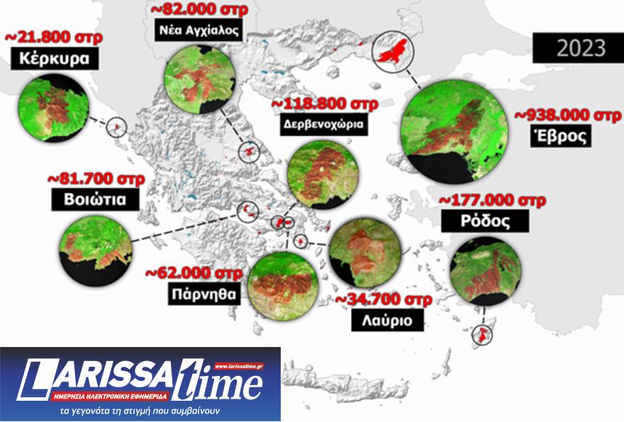Μιλώντας για τις δασικές πυρκαγιές οι επιστήμονες ανέφεραν ότι ο συνολικός αριθμός καμένων εκτάσεων το 2023 έφτασε τα 1.740.000 στρ, αριθμός πολύ μεγαλύτερος από τον ετήσιο μέσο όρο καμένων εκτάσεων της περιόδου 2006-2023. Η μεγαλύτερη σε έκταση ήταν η πυρκαγιά στον Εβρο, η οποία εκτιμάται ότι έκαψε περίπου 938.000 στρέμματα. αποτελώντας την μεγαλύτερη πυρκαγιά που έχει ποτέ καταγραφεί σε ευρωπαϊκό έδαφος από το 2000 μέχρι και σήμερα. Η πυρκαγιά προέκυψε από τη συνένωση δύο συμβάντων. Καθοριστικό ρόλο στην εκρηκτική ανάπτυξη της πυρκαγιάς έπαιξαν οι πολύ ξηρές ατμοσφαιρικές συνθήκες που επέτρεψαν τη σημαντική επιτάχυνση του ρυθμού εξάπλωσης της φωτιάς.