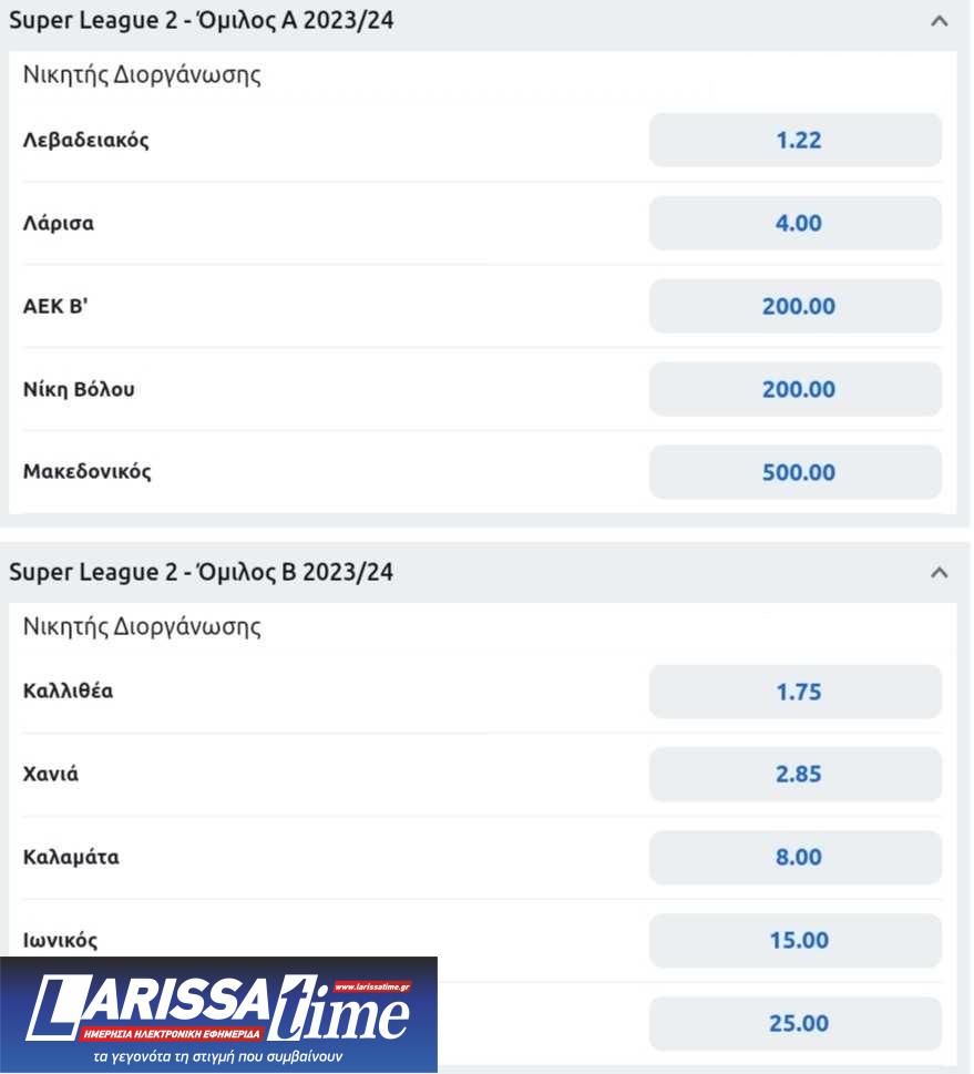 Με αφορμή την ολοκλήρωση της κανονικής διάρκειας του πρωταθλήματος της Superleague 2 και λίγο πριν την έναρξη των Play offs, το aelole.gr συγκέντρωσε και σας παραθέτει τις νέες στοιχηματικές αποδόσεις ομάδων και των δύο ομίλων για την 1η θέση. Ο Λεβαδειακός είναι σύμφωνα με τις αποδόσεις που έβγαλαν ξένες στοιχηματικές εταιρίες για το διαδικτυακό «Πάμε Στοίχημα» το πρώτο φαβορί για την άνοδο στον όμιλο Α’, με απόδοση που έχει οριστεί στο 1.22, ενώ στη δεύτερη θέση των φαβορί ακολουθεί η ΑΕΛ με την τιμή να έχει καθοριστεί στο 4. Στον όμιλο Β’ πρώτο φαβορί είναι η Καλλιθέα με 1.75 ακολουθούν τα Χανιά με 2.85, η Καλαμάτα με 8, ο Ιωνικός με 15 και η Ηλιούπολη με 25. Δείτε αναλυτικά παρακάτω τους δύο πίνακες με τις αποδόσεις.