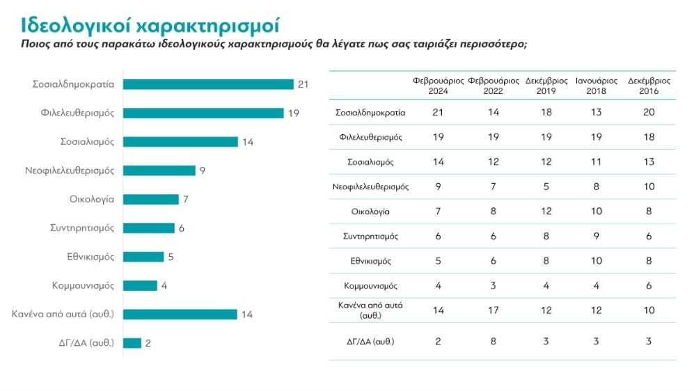 Η έρευνα ανοίγει με ερωτήσεις που ανιχνεύουν την πολιτική τοποθέτηση των συμμετεχόντων. Οι ερωτώμενοι αρχικά καλούνται να αυτο-τοποθετηθούν ιδεολογικά, επιλέγοντας τον χαρακτηρισμό που τους εκφράζει περισσότερο.