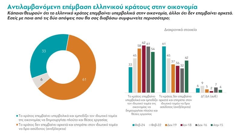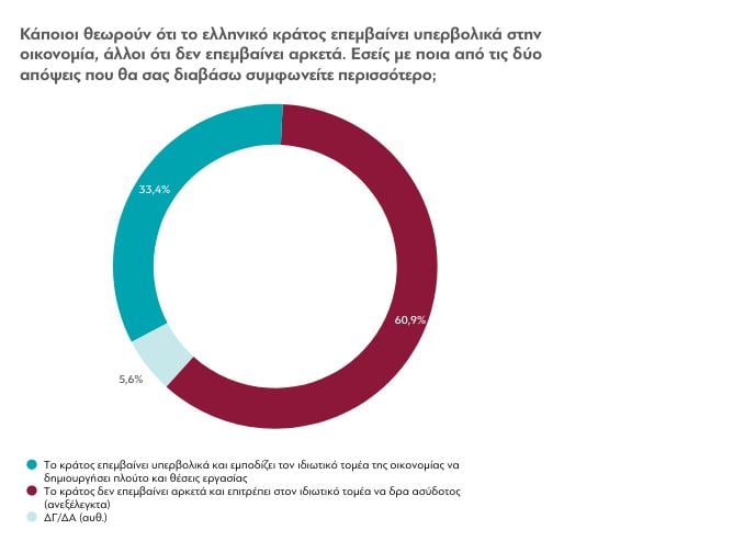 - 1 στους 3 πιστεύει ότι το κράτος επεμβαίνει αρκετά, εμποδίζοντας τον ιδιωτικό τομέα της οικονομίας