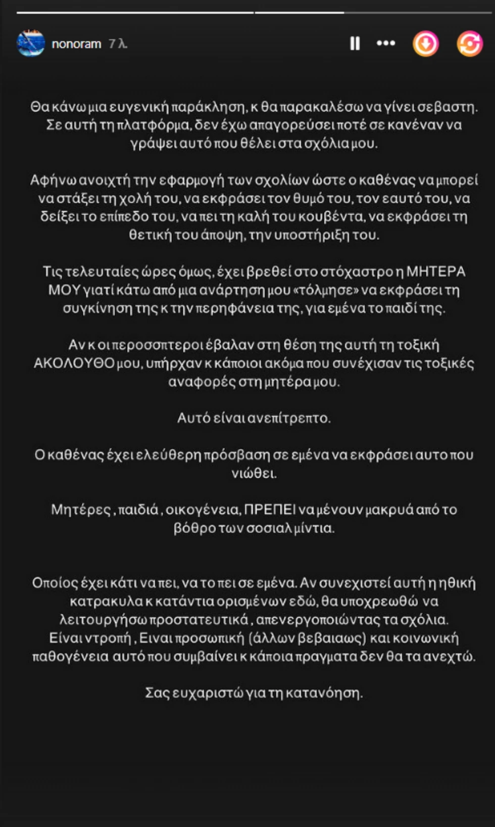 Σε μια προσπάθεια να προστατέψει τα αγαπημένα της πρόσωπα, η Ελεονώρα Μελέτη απενεργοποίησε τα σχόλια στην ανάρτησή της και εξέφρασε στους followers της την επιθυμία να μην απευθύνονται σε μέλη της οικογένειάς της με τέτοιο τρόπο, όταν έχουν κάτι να της επισημάνουν.