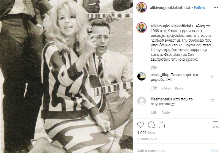 Στην πιο πρόσφατη ανάρτησή του, δημοσίευσε μια φωτογραφία της εθνικής σταρ της ελληνικής υποκριτικής τέχνης, στην οποία απεικονίζεται η Αλίκη Βουγιουκλάκη να ερμηνεύει ένα τραγούδι, κρατώντας ένα μικρόφωνο στο χέρι της. Η συγκεκριμένη εικόνα είναι ιστορικής σημασίας, καθώς ελήφθη κατά τη διάρκεια του φεστιβάλ Καννών το 1966, αποτυπώνοντας μια σημαντική στιγμή της καριέρας της.